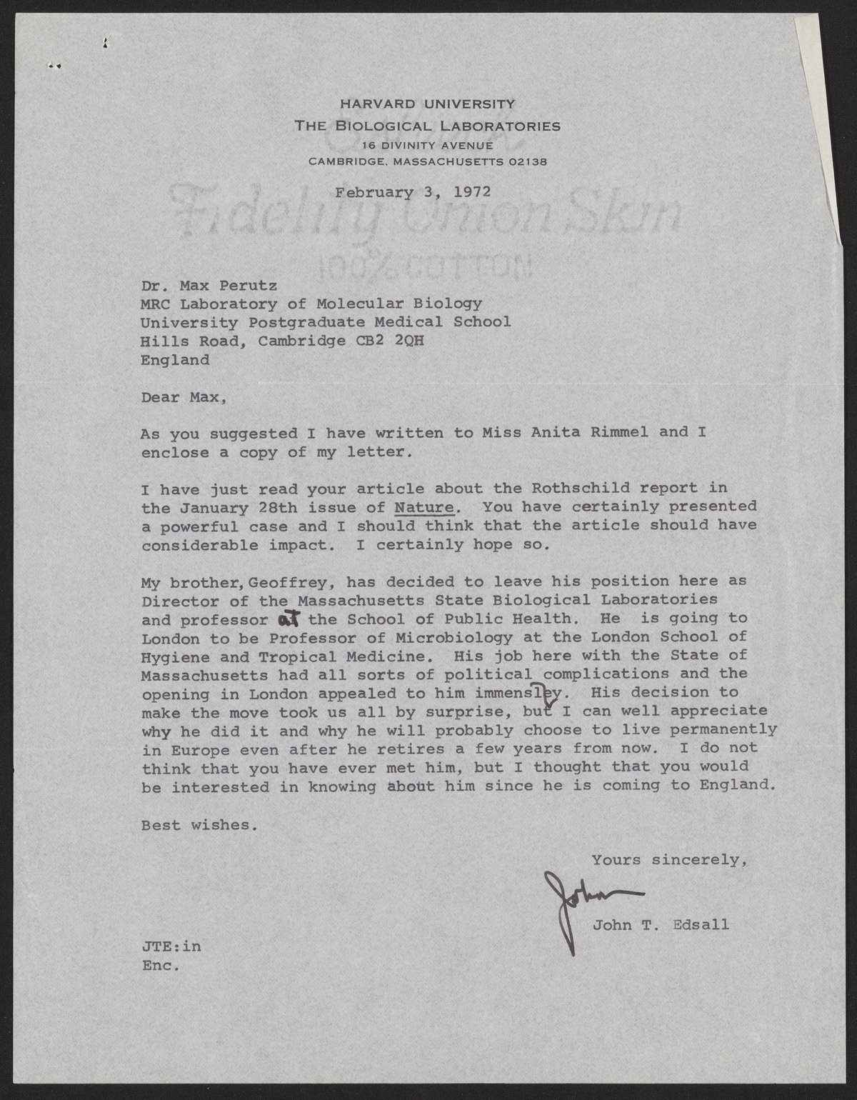 Letter from John T. Edsall to Max Perutz, February 3, 1972