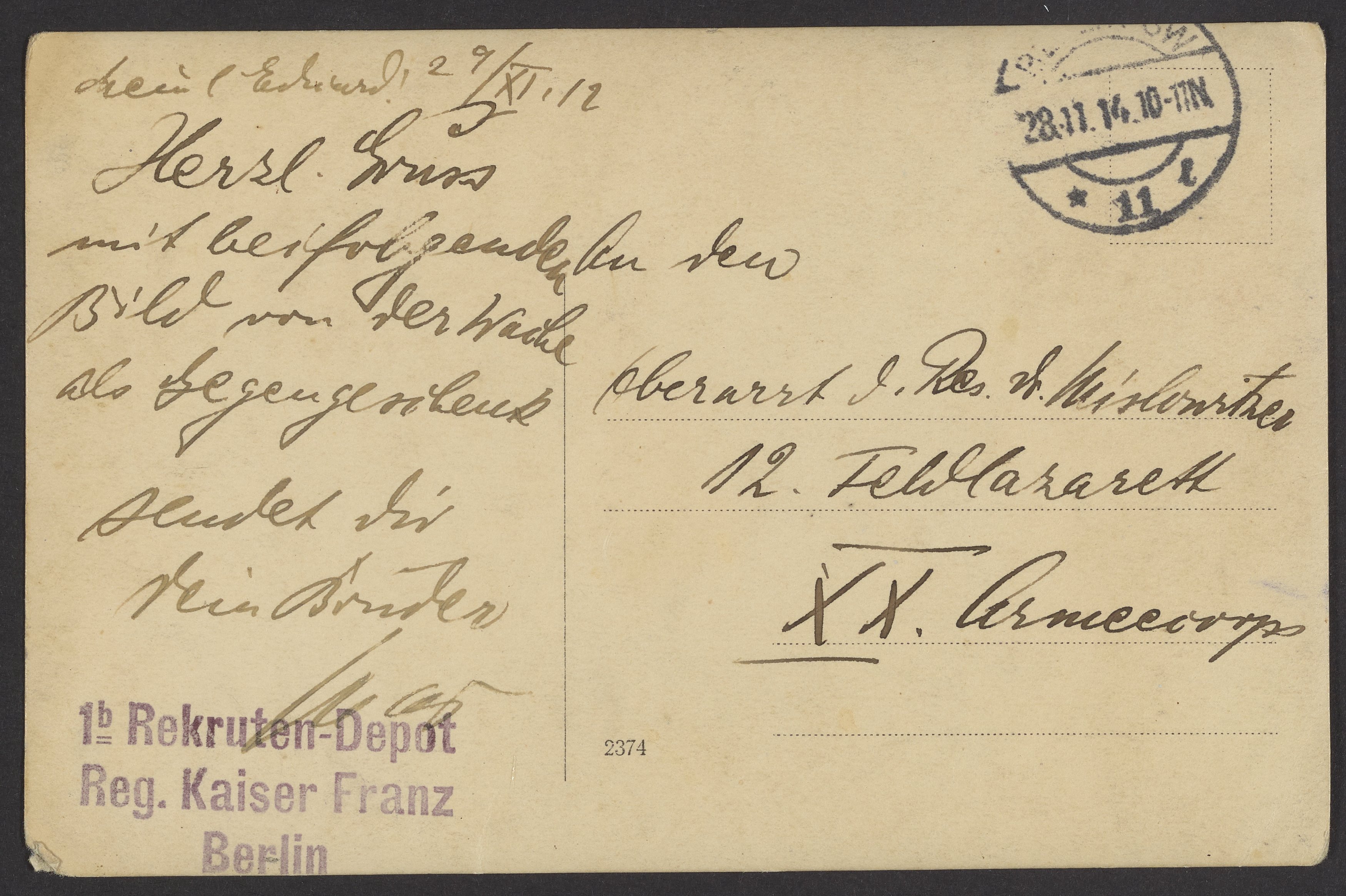 Small JPG1200 x 804px — 128 KBLarge JPG2880 x 1930px — 590 KBFull-sized JPG3506 x 2350px — 828 KBOriginal fileTIFF — 3506 x 2350px — 23.6 MBPostcard from Max Mislow (1887-1963), Kurt Mislow's (1923-2017) father, to an unknown recipient. The postcard features a black and white photograph of German soldiers wearing Pickelhauben, the pointed or spiked helmet worn by Prussian and German soldiers, firefighters, and police officers during the 19th and 20th centuries. Max Mislow is on the far right, wearing a woolen coat.