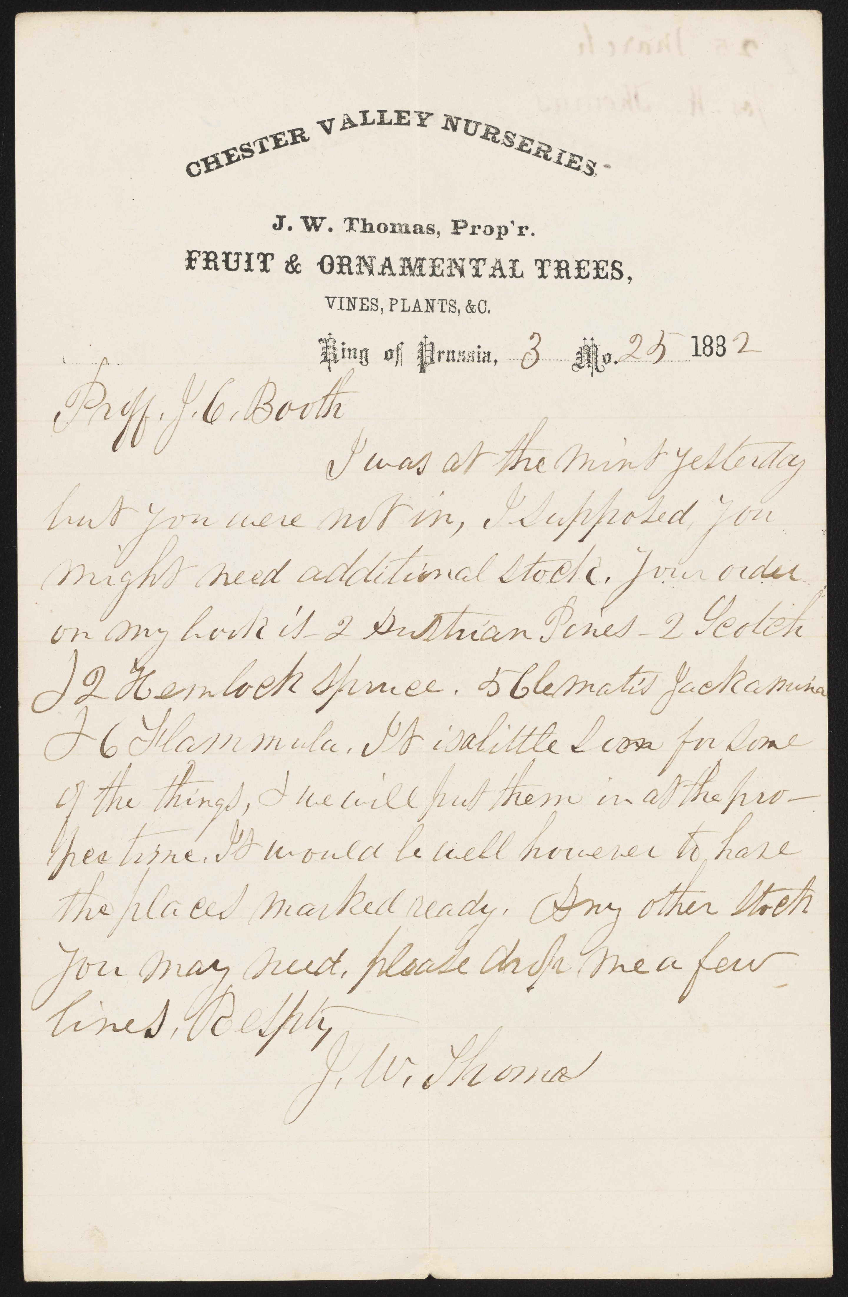 Small JPG1200 x 1835px — 259 KBLarge JPG2880 x 4405px — 1.1 MBFull-sized JPG3789 x 5795px — 1.8 MBOriginal fileTIFF — 3789 x 5795px — 62.9 MBJoseph W. Thomas writes to James Curtis Booth (1810-1888) regarding trees.