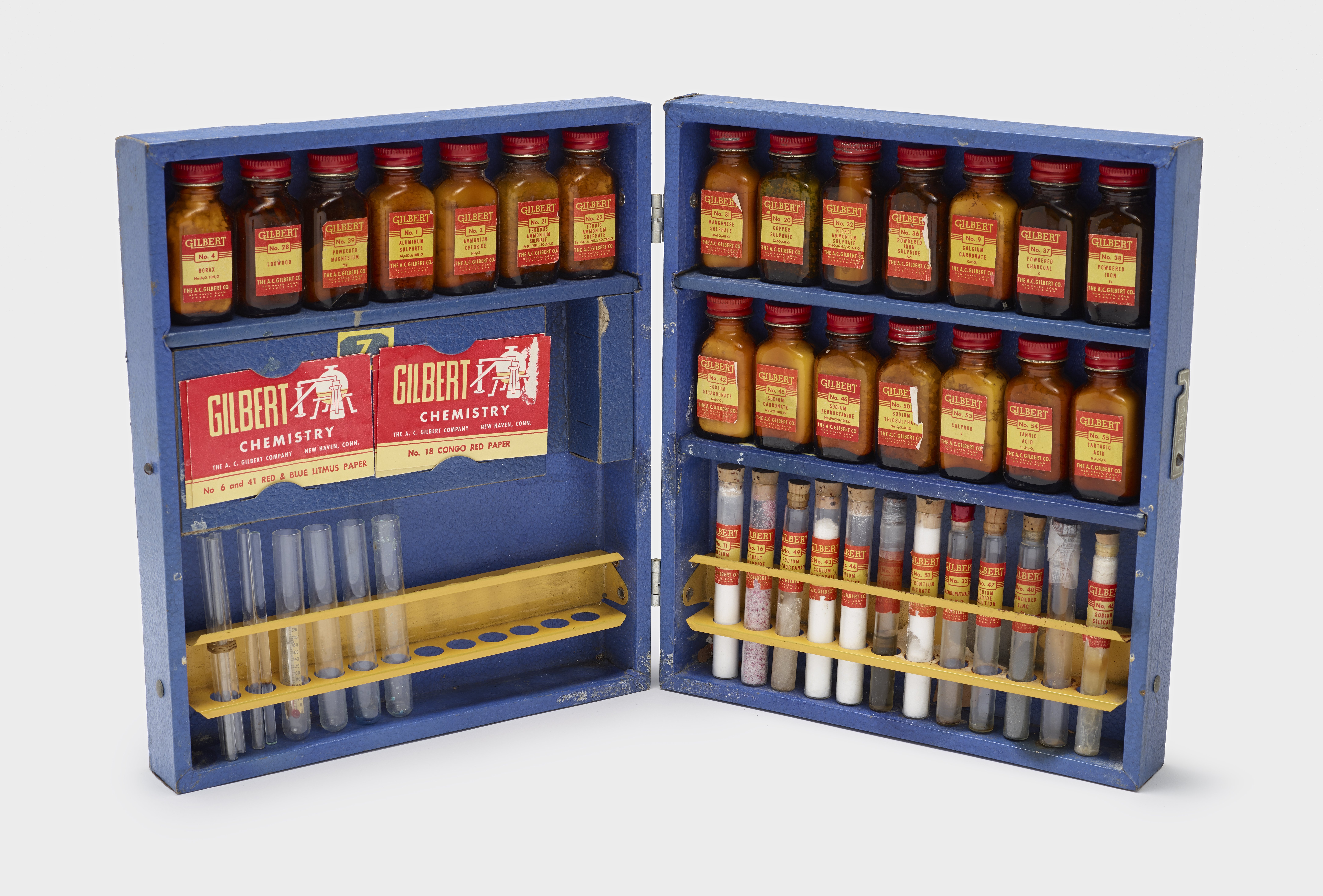 Small JPG1200 x 813px — 168 KBLarge JPG2880 x 1951px — 714 KBFull-sized JPG8664 x 5870px — 4.8 MBOriginal fileTIFF — 8664 x 5870px — 146 MBWooden case with a blue synthetic covering. Case opens on a hinge to reveal three shelves of amber glass bottles with red metal lids; 21 bottles containing the following: aluminum sulphate, ammonium chloride, borax, calcium carbonate, copper sulphate, ferrous ammonium sulphate, ferric ammonium sulphate, logwood, manganese sulphate, nickel ammonium sulphate, powdered charcoal, powdered iron sulphide, powered iron; sodium bicarbonate, sodium carbonate, sodium ferrocyanide, sodium thiosulphate, sulphur, tannic acid, tartaric acid, and powdered magnesium; left side of box has one shelf with seven bottles; right side of box has two shelves with seven bottles on top shelf and seven bottles on the bottom shelf; bottom of each side of box has a yellow metal test-tube holder; yellow test tube holder on left holds three test tubes, one test tube with a thermometer, and five rods; yellow test tube holder on right holds twelve test tubes, eleven of the test tubes contain the following: calcium oxide, cobalt chloride, glycerine, sodium bisulphate, sodium bisulphide, sodium sulphocyanate, strontium nitrate, phenolphthalein, sodium iodide solution, powdered zinc, and sodium silicate; set comes with packages of congo red, calcium sulphide, red and blue litmus, and sulphide test paper attached to a blue cardboard insert. Set includes two manuals.