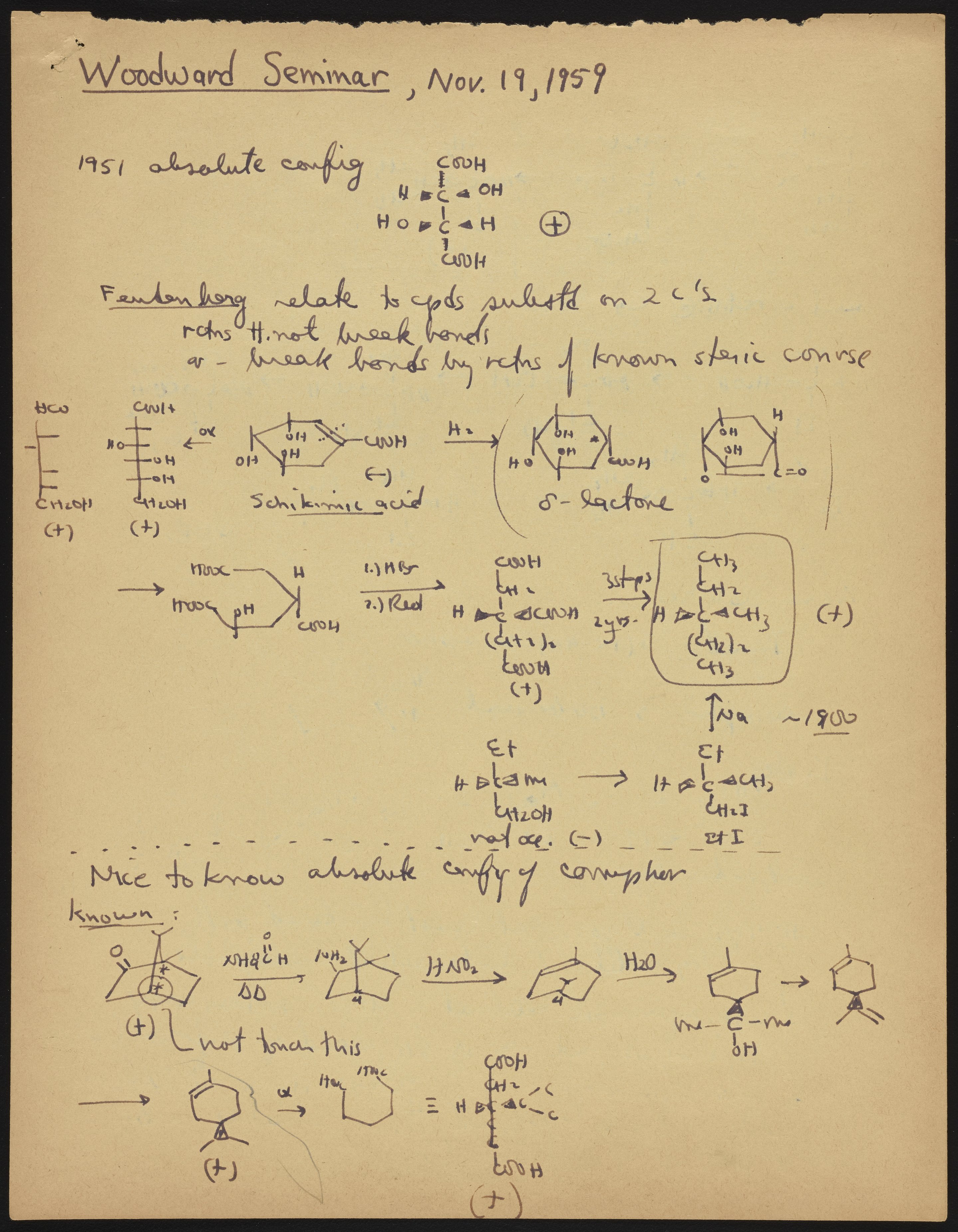 Kohler, Robert E. “Untitled R. B. (Robert Burns) Woodward Seminar Mentioning Camphor.” Notes from R. B. (Robert Burns) Woodward's Seminars, circa 1959–1966. Folder 2. Science History Institute. Philadelphia. https://digital.sciencehistory.org/works/db78tc90h.
