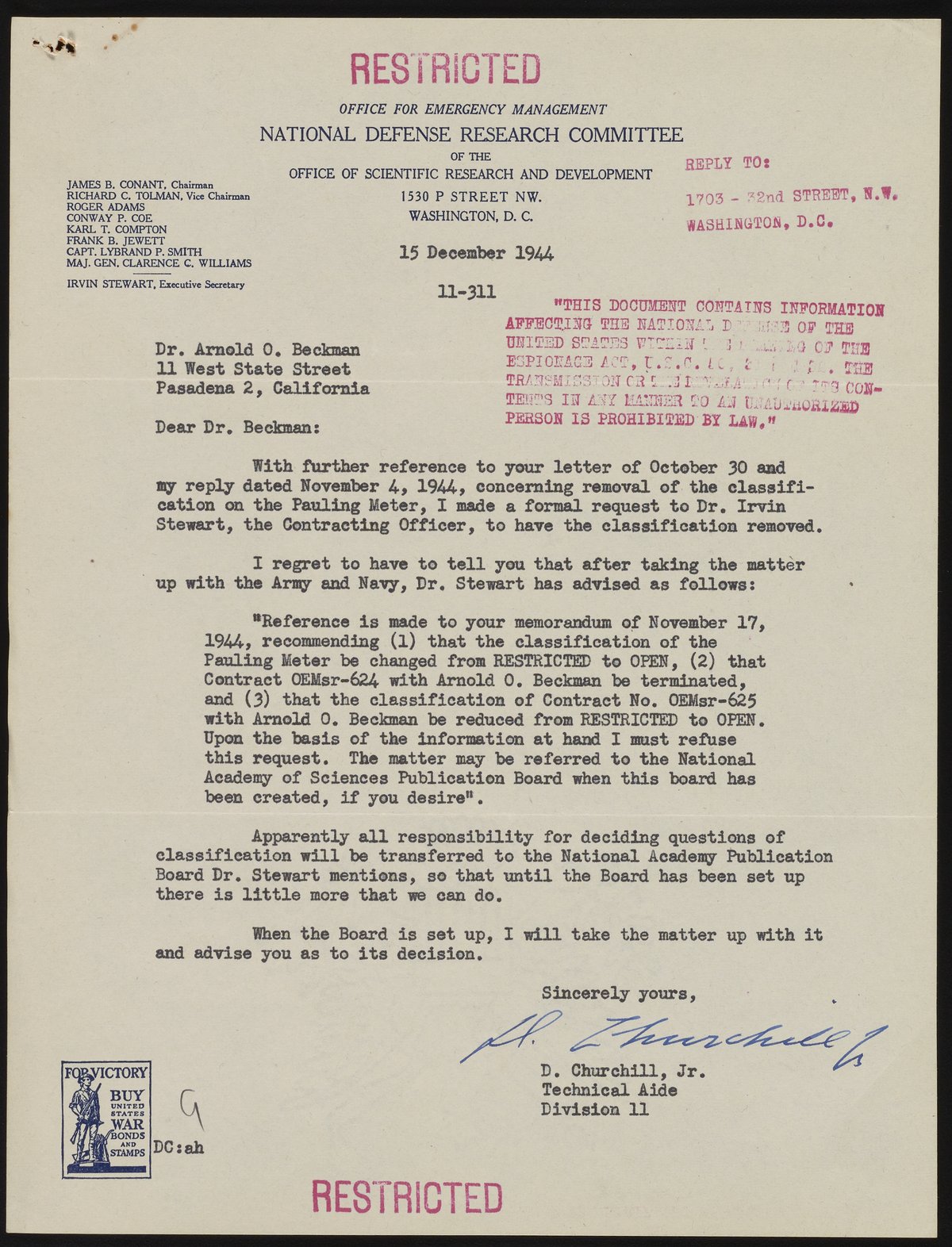 Churchill, Durand, Jr. “Letter from Durand Churchill, Jr. to Arnold O. Beckman,” December 15, 1944. Beckman Historical Collection, Box 19, Folder 8. Science History Institute. Philadelphia. https://digital.sciencehistory.org/works/df65v785p.