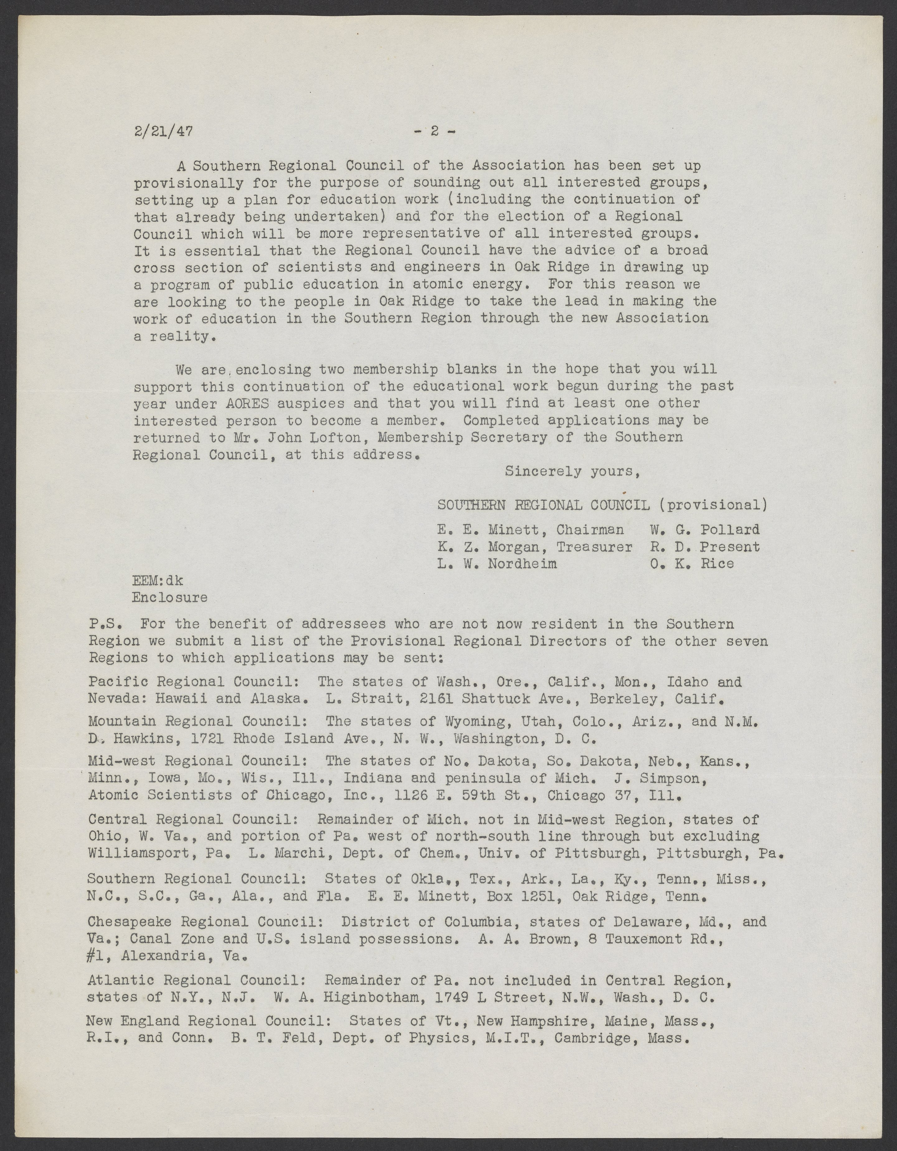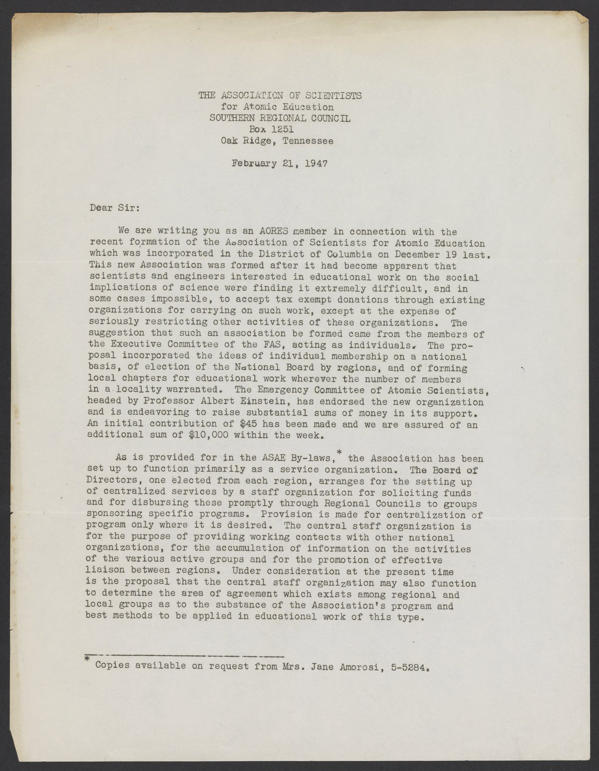Small JPG1200 x 1545px — 297 KBLarge JPG2880 x 3707px — 1.7 MBFull-sized JPG5386 x 6933px — 6.1 MBOriginal fileTIFF — 5386 x 6933px — 107 MBLetter to the members of the Association of Oak Ridge Engineers and Scientists (AORES) from the newly formed Association of Scientists for Atomic Education (ASAE). ASAE was founded on December 19, 1946. It was created for scientists and engineers interested in educating others on the social implications of science.