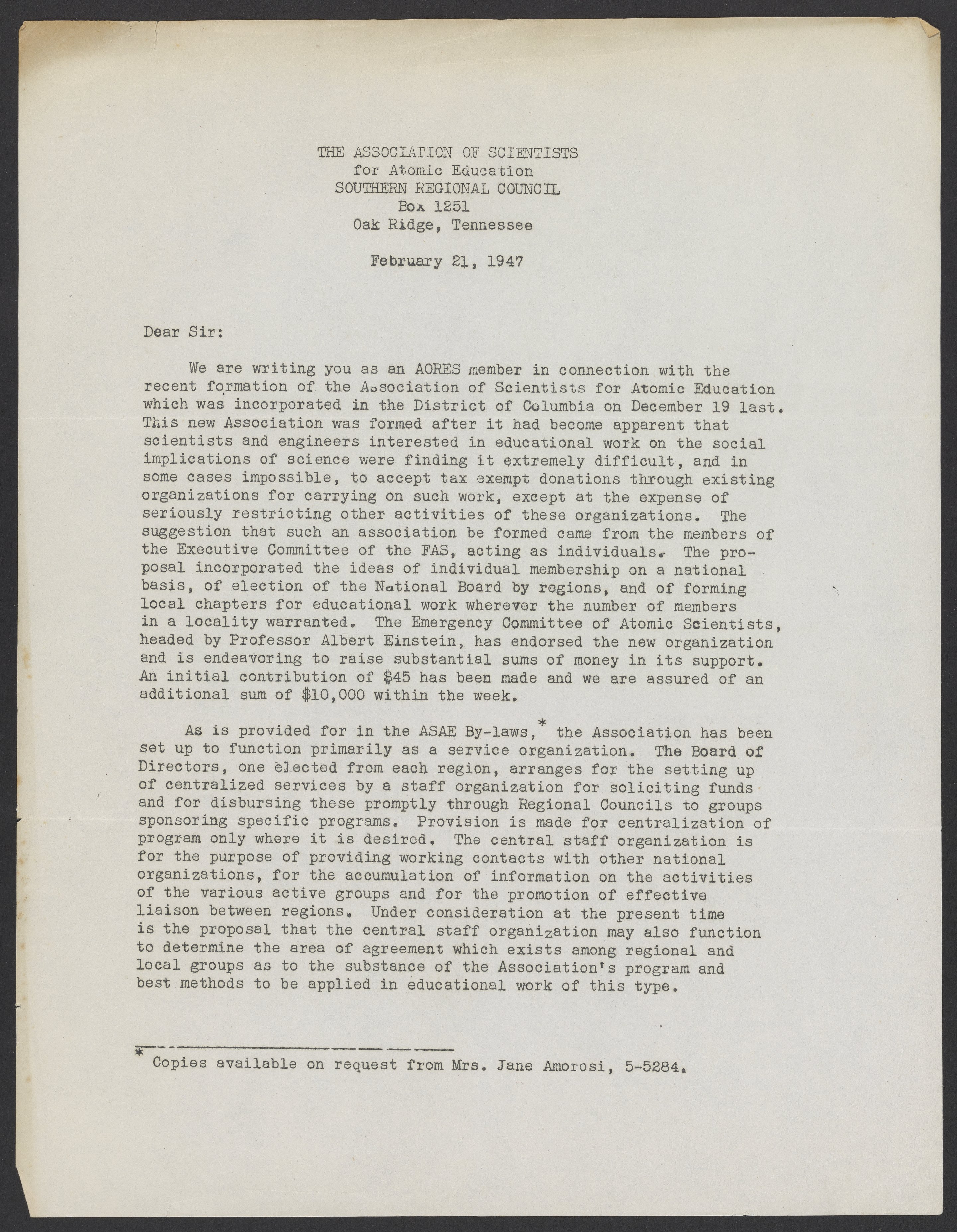 Informational letter about the Association of Scientists for Atomic Education