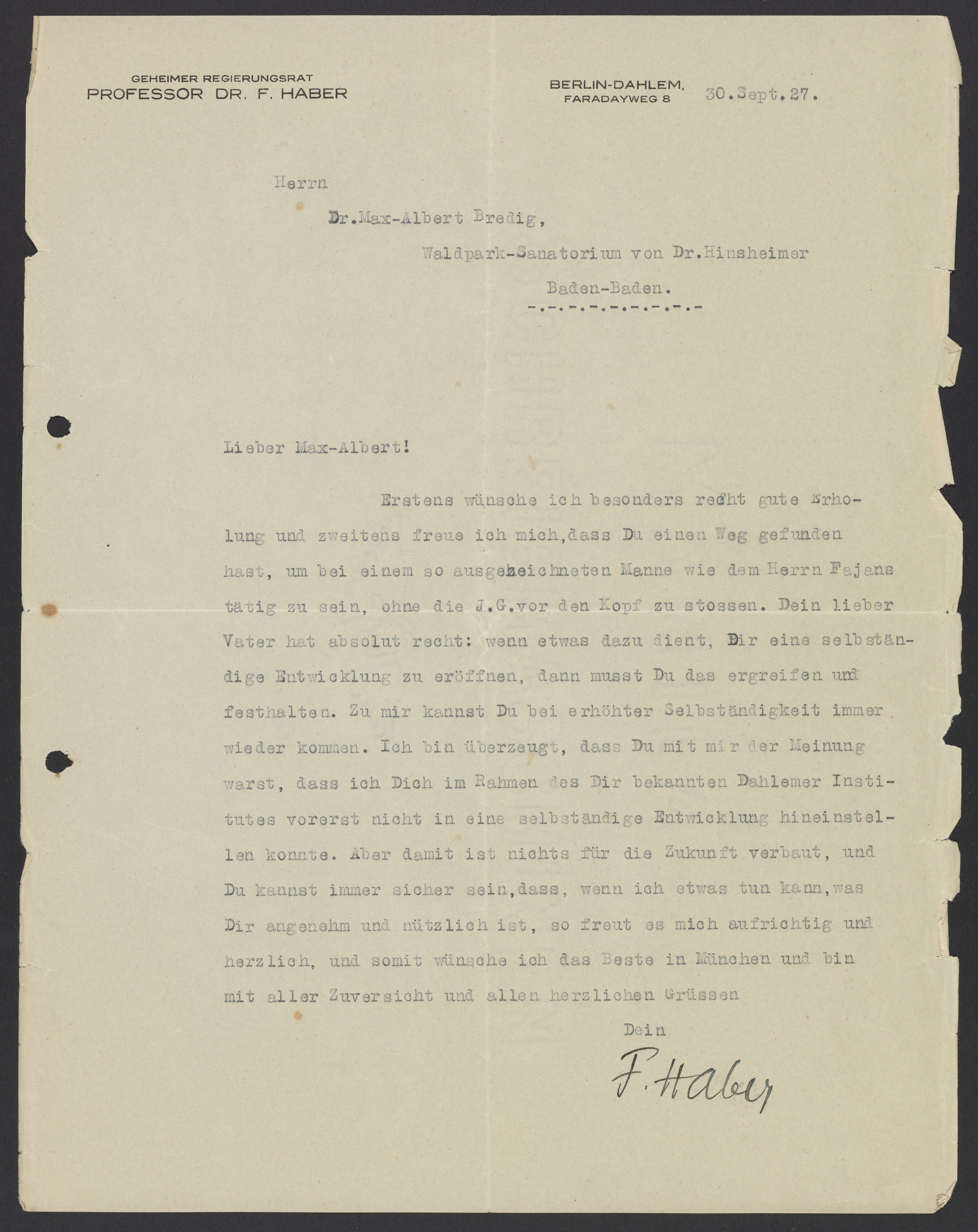 Haber, Fritz. “Letter from Fritz Haber to Max Bredig, September 30, 1927,” September 30, 1927. Papers of Georg and Max Bredig, Box 8, Folder 10. Science History Institute. Philadelphia. https://digital.sciencehistory.org/works/dgdu5pw.