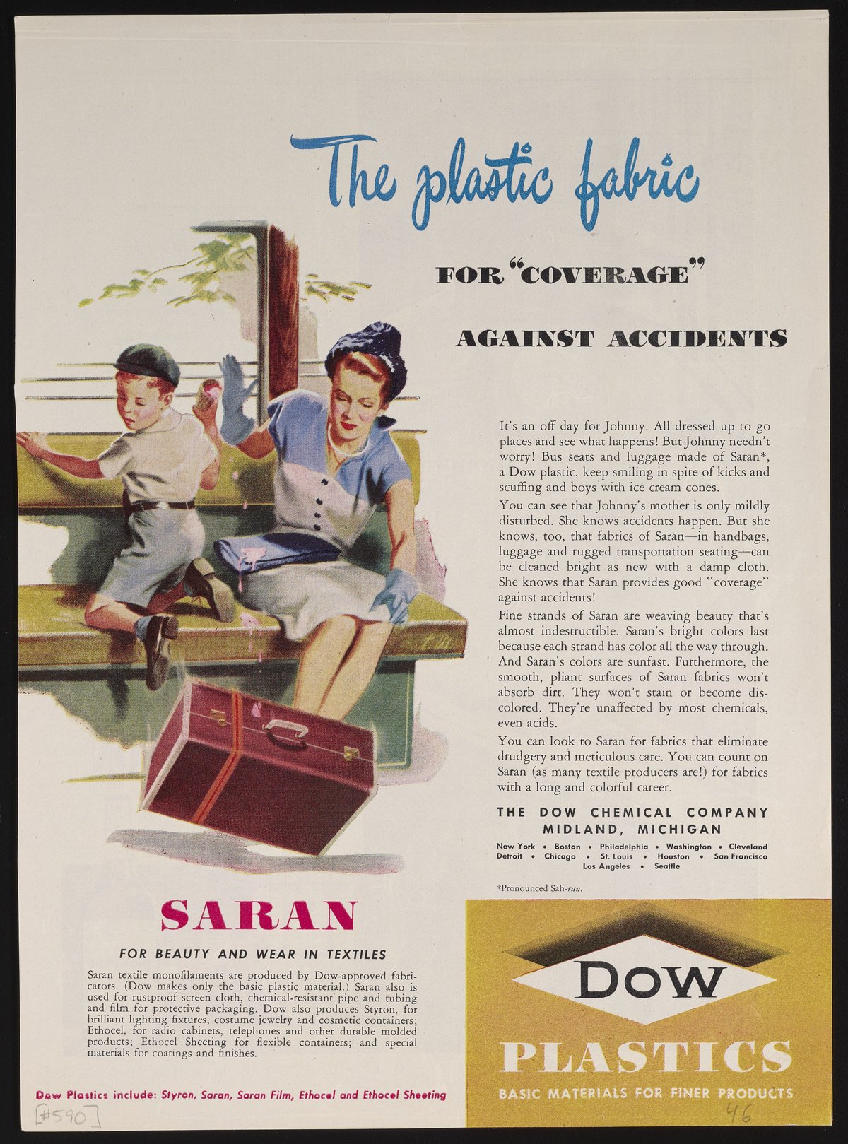 Dow Chemical Company. “The Plastic Fabric for ‘Coverage’ Against Accidents,” circa 1946. Advertisements from the Dow Chemical Historical Collection, Box 9. Science History Institute. Philadelphia. https://digital.sciencehistory.org/works/dhe5803.