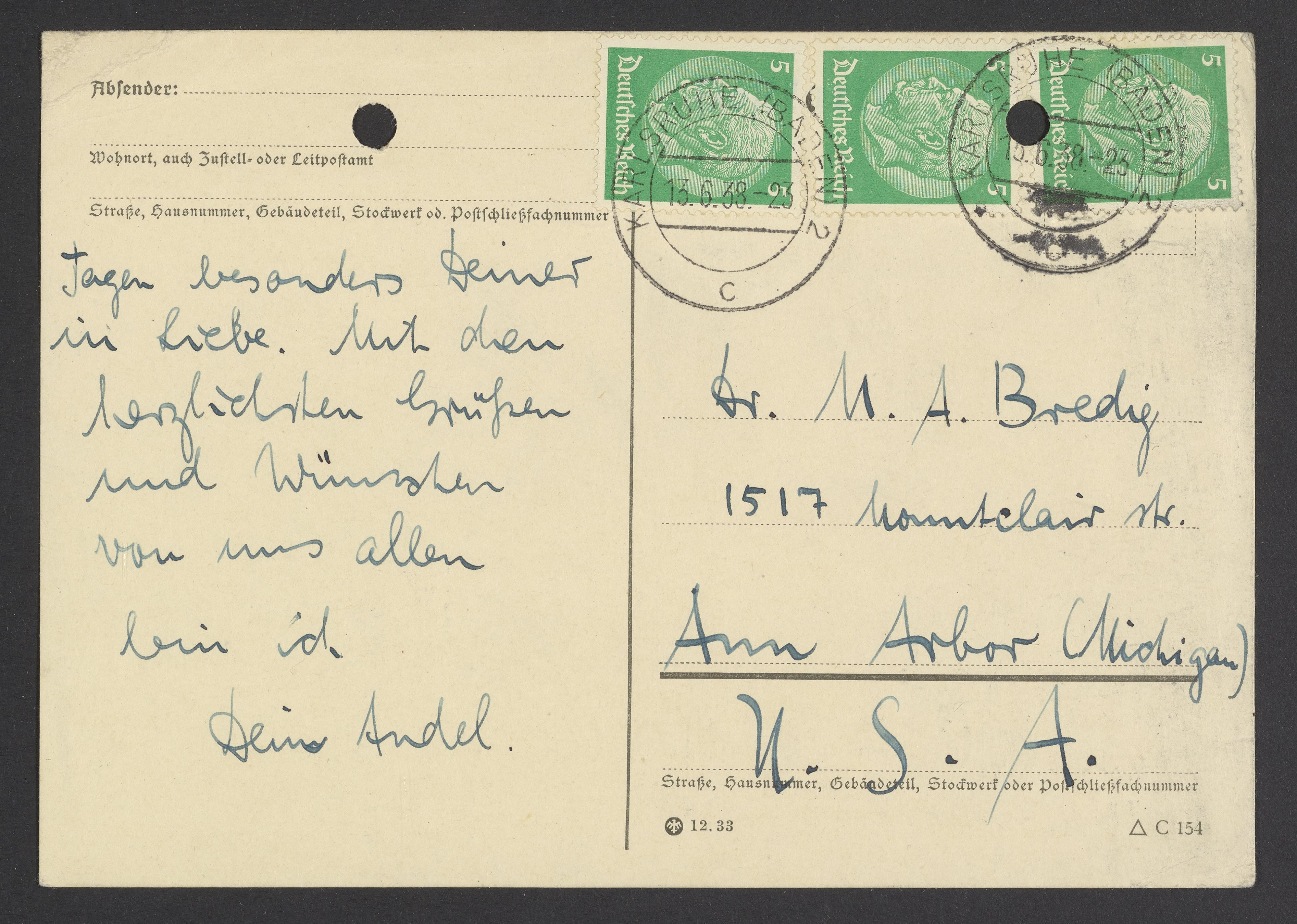Homburger, Marianne. “Postcard from Marianne Homburger to Max Bredig, June 13, 1938,” June 13, 1938. Papers of Georg and Max Bredig, Box 8, Folder 21. Science History Institute. Philadelphia. https://digital.sciencehistory.org/works/dhxl0gn.