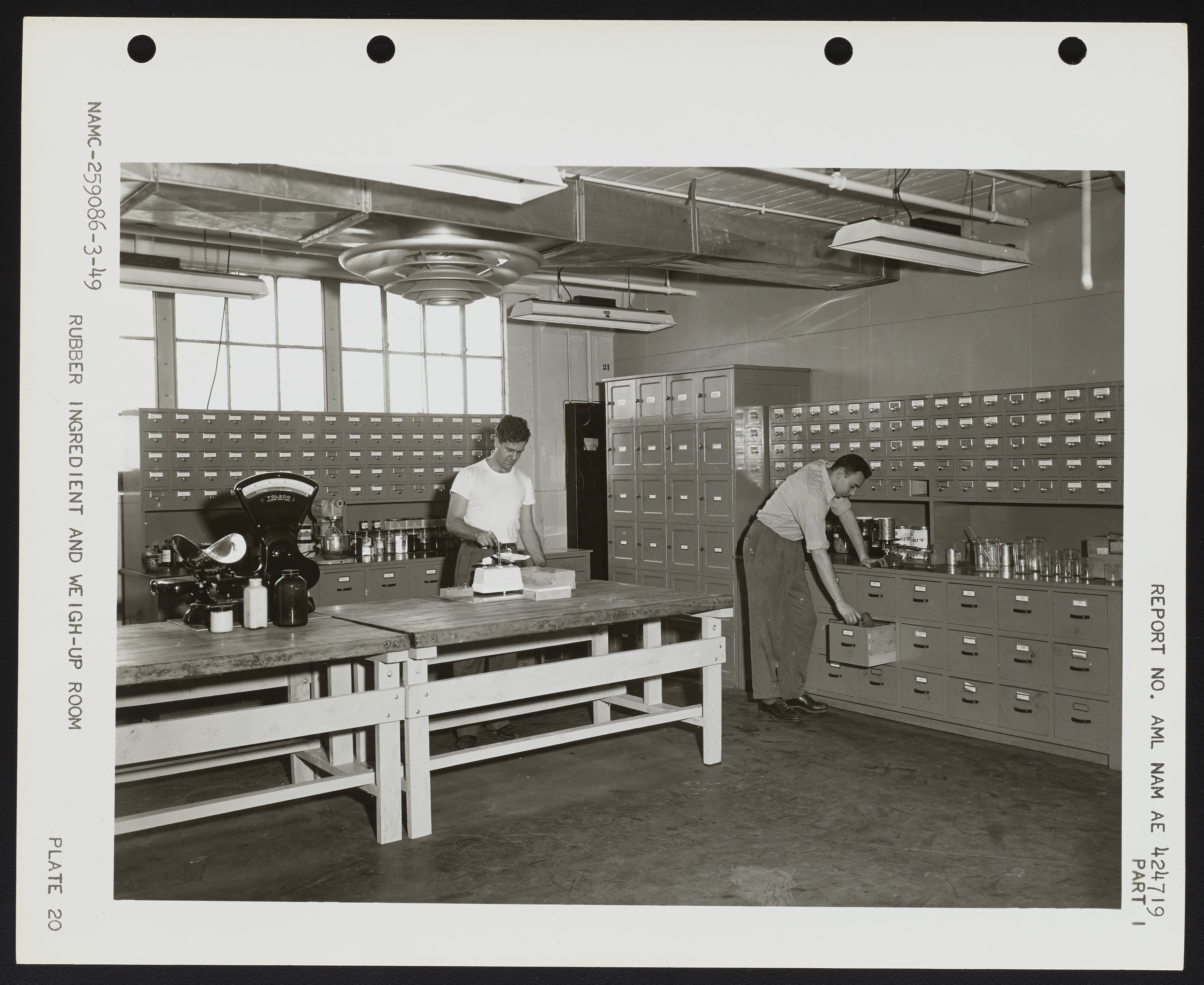 General view of the Rubber Ingredient and Weigh-Up Room at the Naval Air Experimental Station. Adjacent to the Rubber Compounding and Processing Laboratory, the room contained cupboards and bins housing over five-hundred distinct ingredients, both solids and liquids, used to compound rubber. The room also contained Toledo Fan Scales, a three-beam balance, and a torsion balance, all used to accurately weigh various rubber compounding ingredients. This photograph was included in a 1949 Naval Air Experimental Station report on compounding rubber.