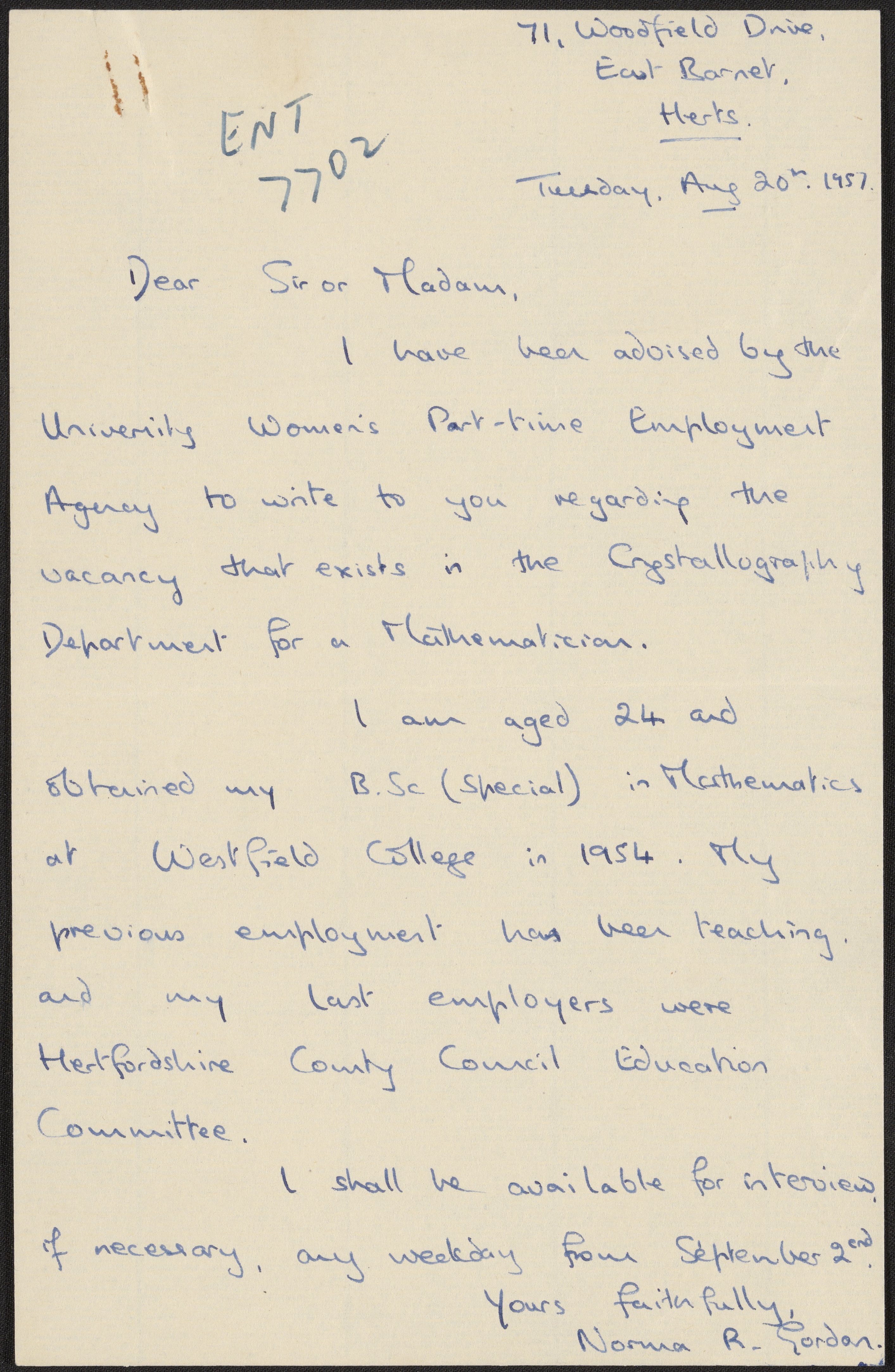 Letter from Norma R. Gordon to Rosalind Franklin, August 20, 1957