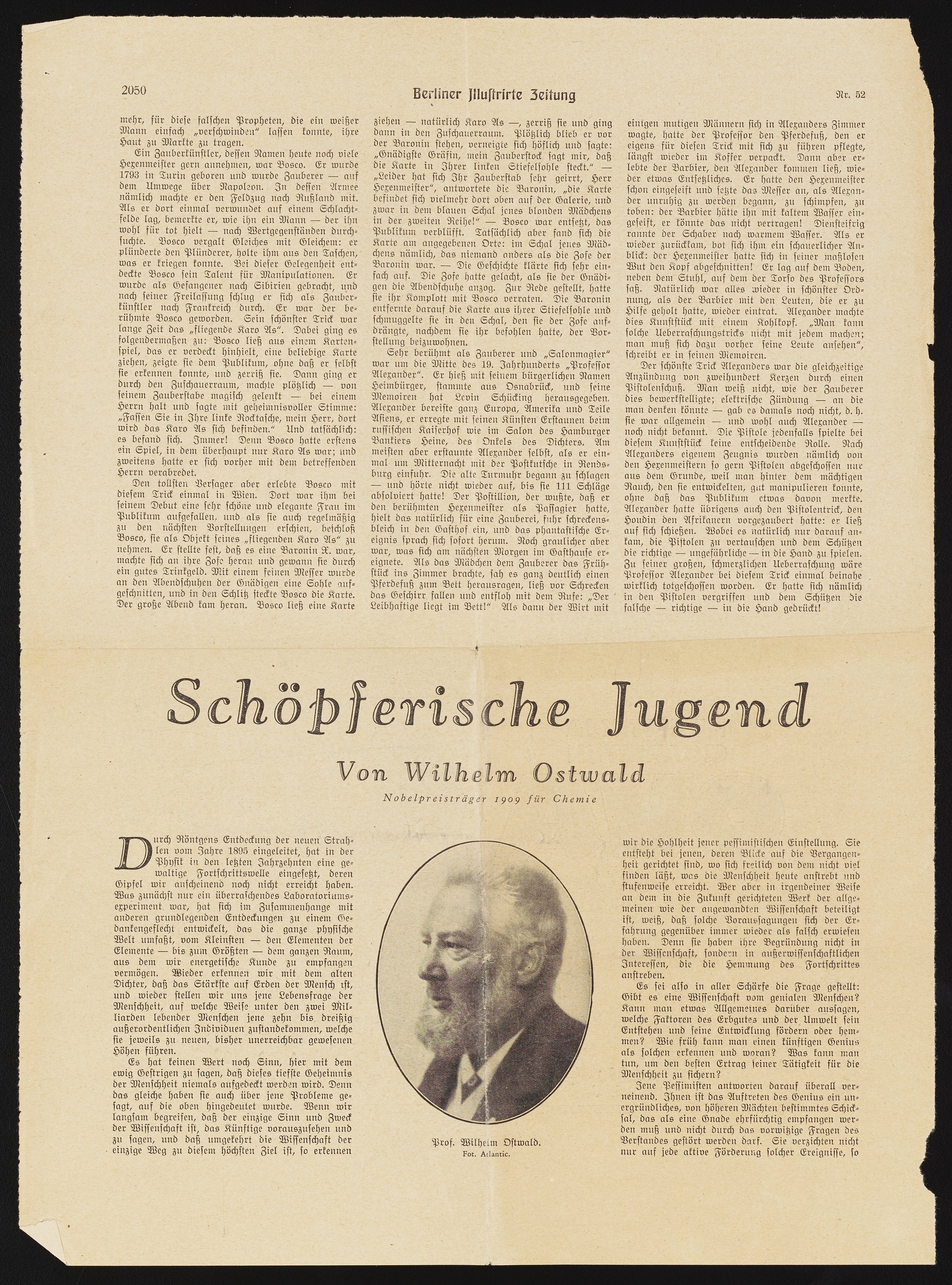 Ostwald, Wilhelm. “Schöpferische Jugend.” Berliner Zeitung (Berlin, Germany : East), December 25, 1931. Papers of Georg and Max Bredig, Box 6, Folder 5. Science History Institute. Philadelphia. https://digital.sciencehistory.org/works/dlzmfmt.