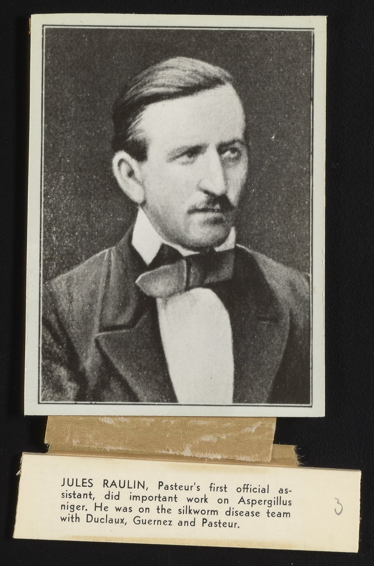 Portrait of French chemist and biologist Jules Raulin (1836-1896). Raulin founded the French chemistry school École supérieure de chimie industrielle de Lyon, currently known as École supérieure de chimie, physique, électronique de Lyon. Raulin was one of Louis Pasteur's (1822-1895) first students. Notably, he studied the nutrition of a mucedinous fungus (mold) known as Aspergillus niger while working with Pasteur. He also researhced a silkworm disease in collaboration with Émile Duclaux (1840-1904), Désiré Gernez (1834–1910) and Pasteur.