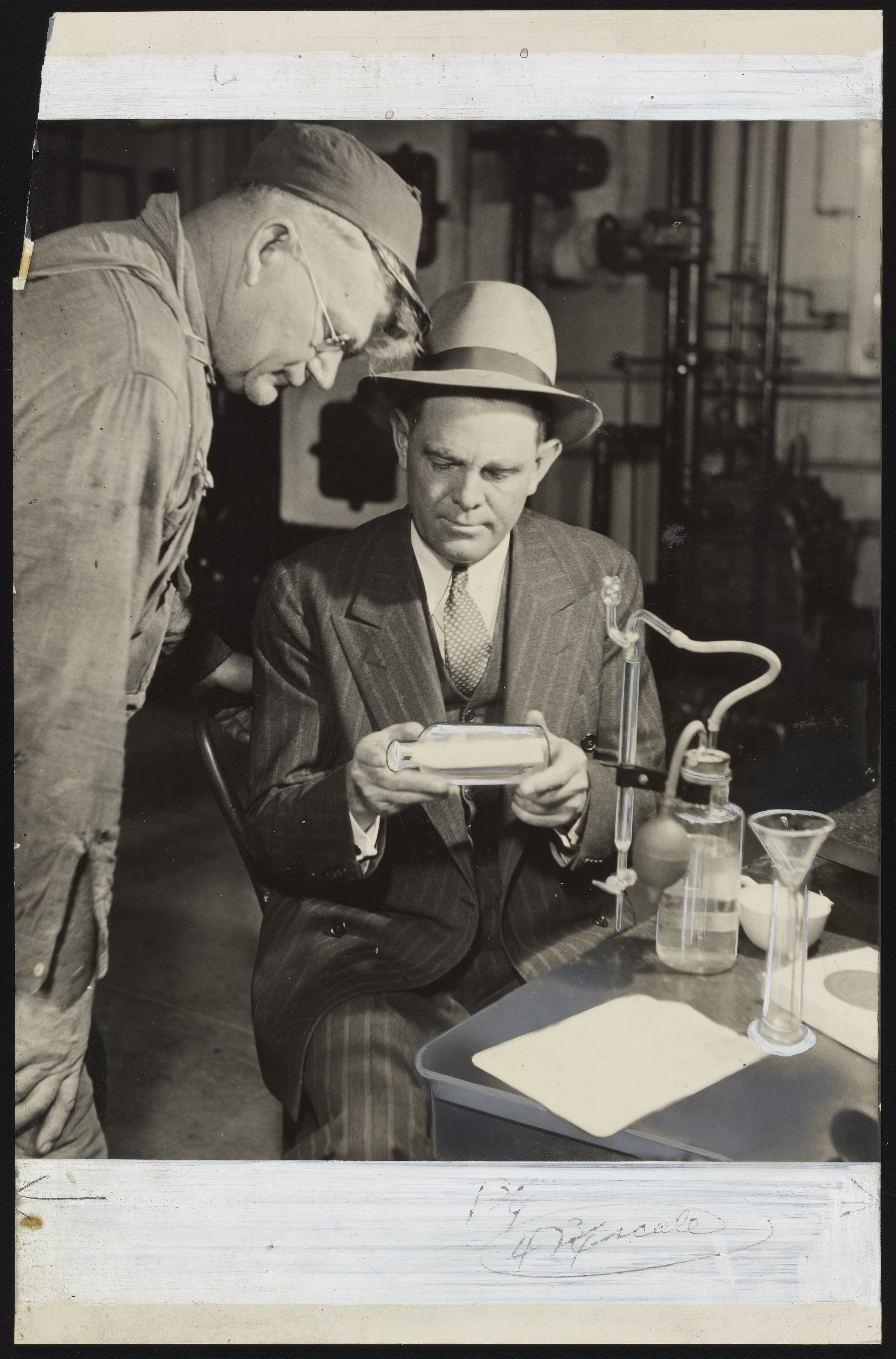 General view of Dearborn Chemical Company representative C.M. Kesler (seated) and hospital employee "Mike" examining a sample of water at Mary's Help Hospital (now Seton Medical Center) in San Francisco, California. Per notations accompanying the photograph, the water was treated with Dearborn compounds and subsequently analyzed for hardness. Founded in 1887, the Dearborn Chemical Company was a corporate ancestor of BetzDearborn, Incorporated best known for manufacturing water treatment chemicals for use in boilers and cooling towers.