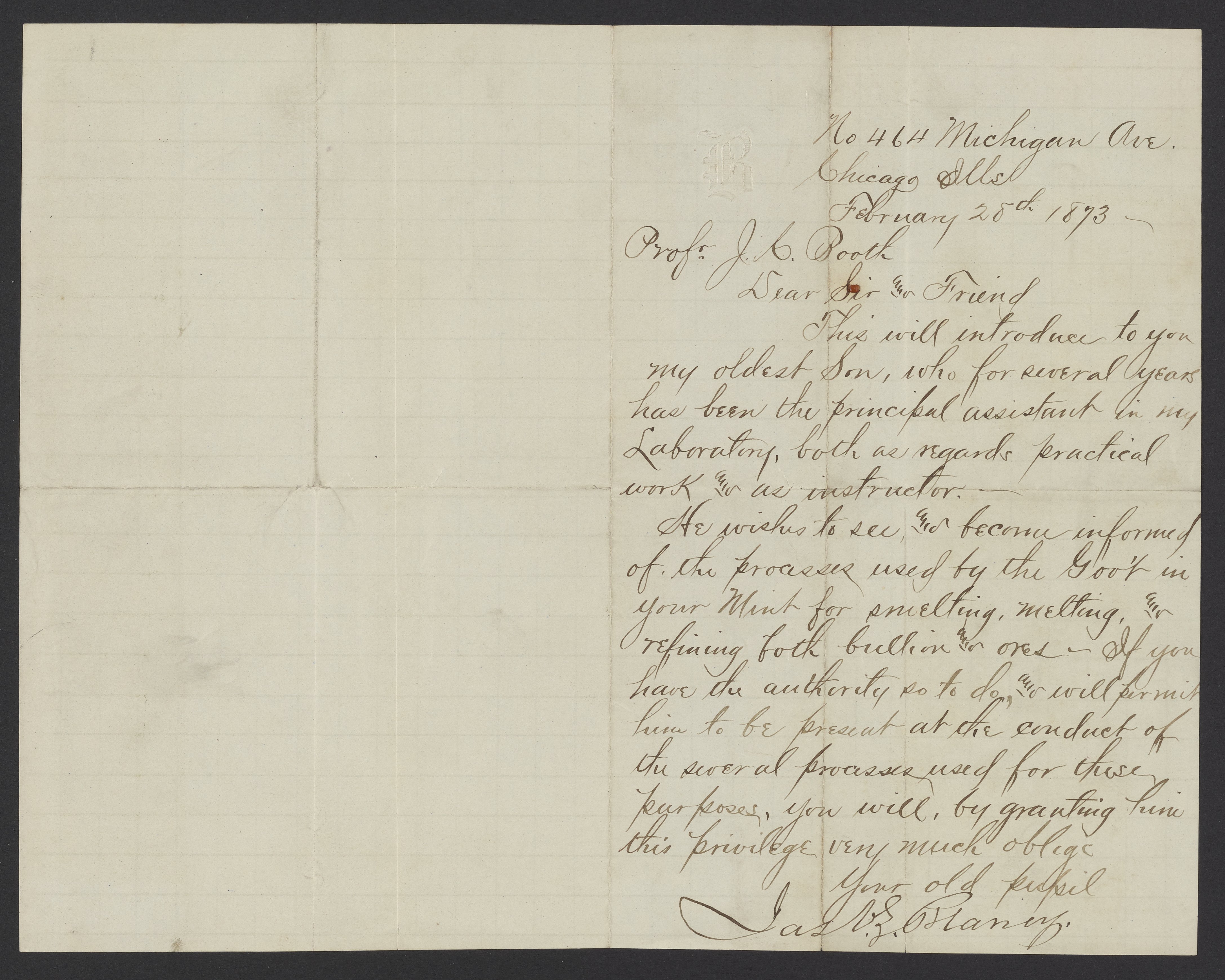 Letter from a Mr. James [Blancy] to James Curtis Booth (1810-1888). Blancy enquires of Booth if his son might observe the smelting and refining operations at the United States Mint.