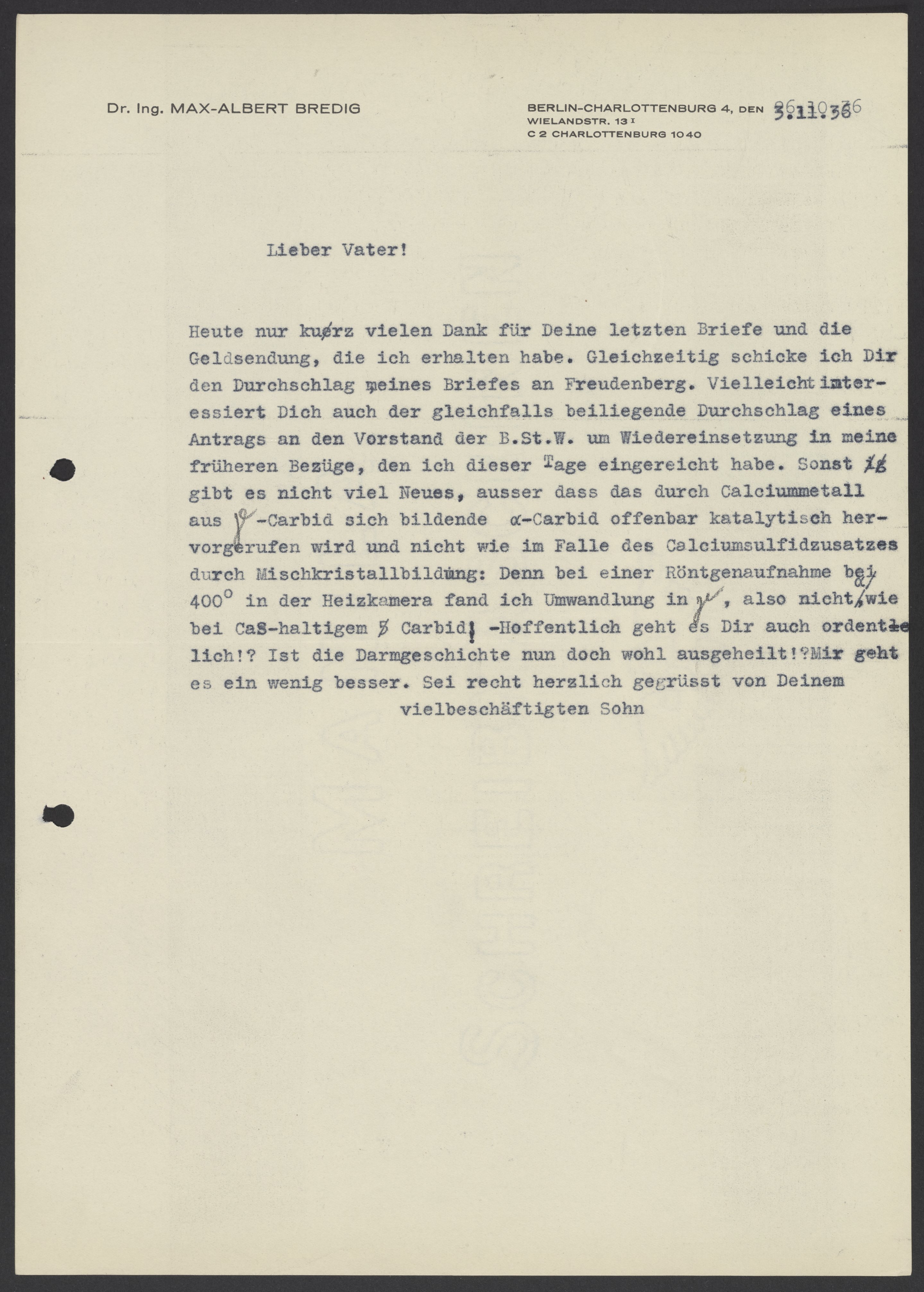 Heute nur kurz vielen Dank für Deine letzten Briefe und die Geldsendung, die ich erhalten habe. Gleichzeitig schicke ich Dir den Durchschlag meines Briefes an Freudenberg. Vielleicht interessiert Dich auch der gleichfalls beiliegende Durchschlag eines Antrags an den Vorstand der B.St.W. um Wiedereinstzung in meine früheren Bezüge, den ich dieser Tage eingereicht habe. Sonst gibt es nicht viel Neues, ausser dass das durch Calciummetall aus γ -Carbid sich bildende α-Carbid offenbar katalytisch hervorgerufen wird und nicht wie im Falle des Calciumsulfidzusatzes durch Mischkristallbildung: Denn bei einer Röntgenaufnahme bei 400° in der Heizkamera fand ich Umwandlung in γ, also nicht α, wie bei CaS-haltigem 5 Carbid! –Hoffentlich geht es Dir auch ordentlich!? Ist die Darmgeschichte nun doch wohl ausgeheilt!? Mir geht es ein wenig besser. Sei recht herzlich gegruesst von Deinem vielbeschäftigten Sohn.