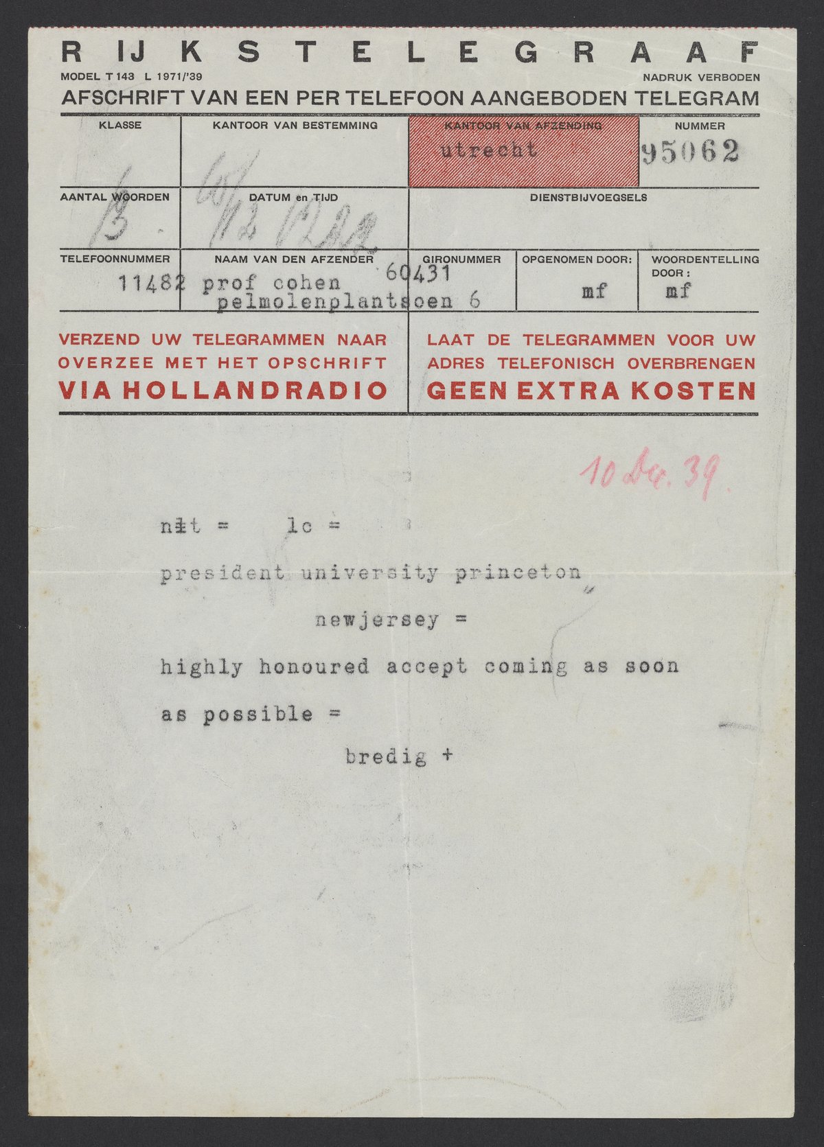 Telegram from Georg Bredig to Harold Willis Dodds, December 10, 1939