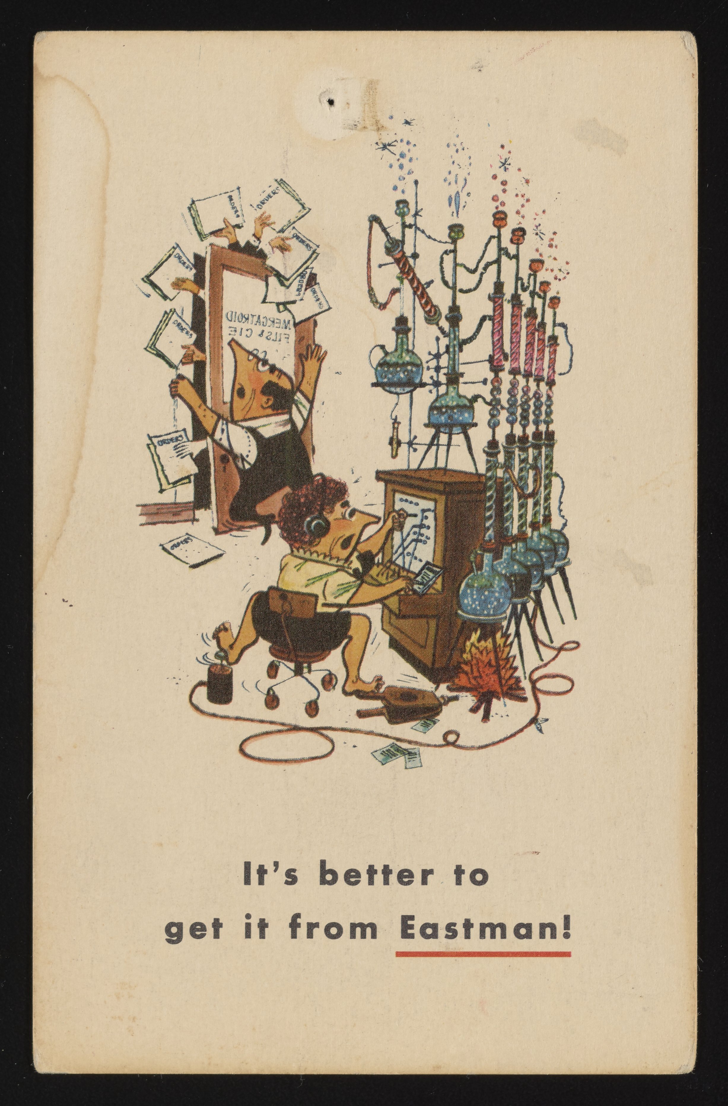 Front and back of an illustrated color postcard advertising the products and services of the Eastman Organic Chemicals Department (Division of the Eastman Kodak Company). The postcard features a humorous depiction of a harried-looking man and woman attempting to brew their own chemicals. Postmarked from Rochester, New York, the postcard also includes a brief summary of Eastman’s available stock of chemical compounds as they pertain to the “chemical businessman.”