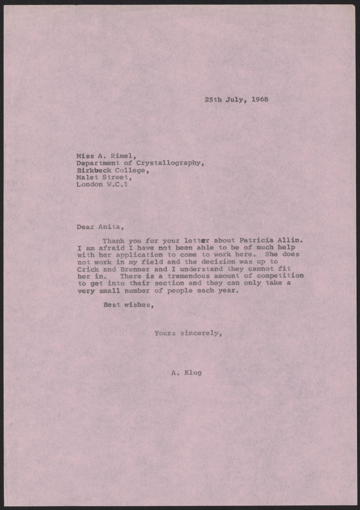 Klug, A. (Aaron), Sir. “Letter from Aaron Klug to Anita Rimel, July 25, 1968,” July 25, 1968. History of Molecular Biology Collection, Box 17, Folder 12. Science History Institute. Philadelphia. https://digital.sciencehistory.org/works/drsq0q1.