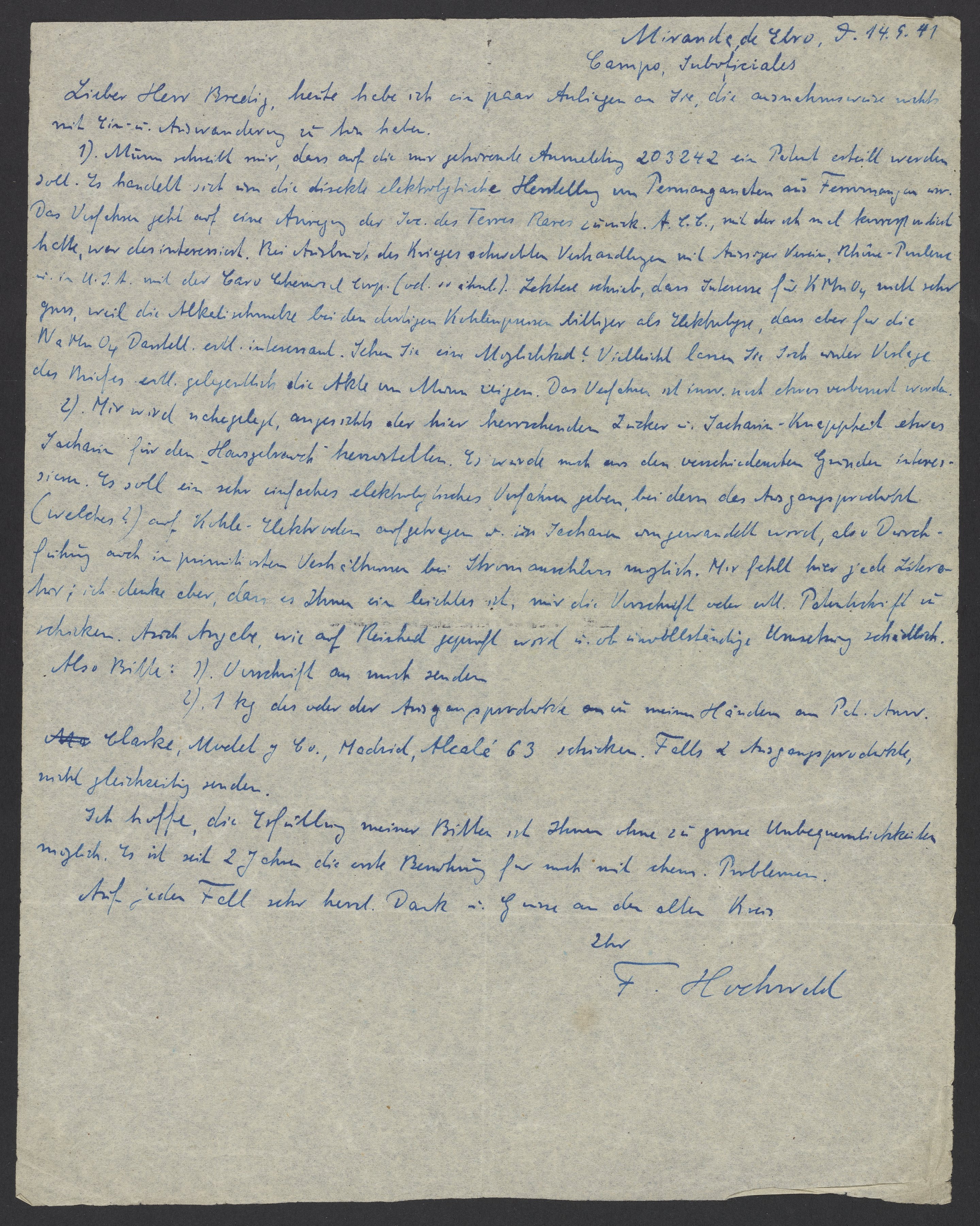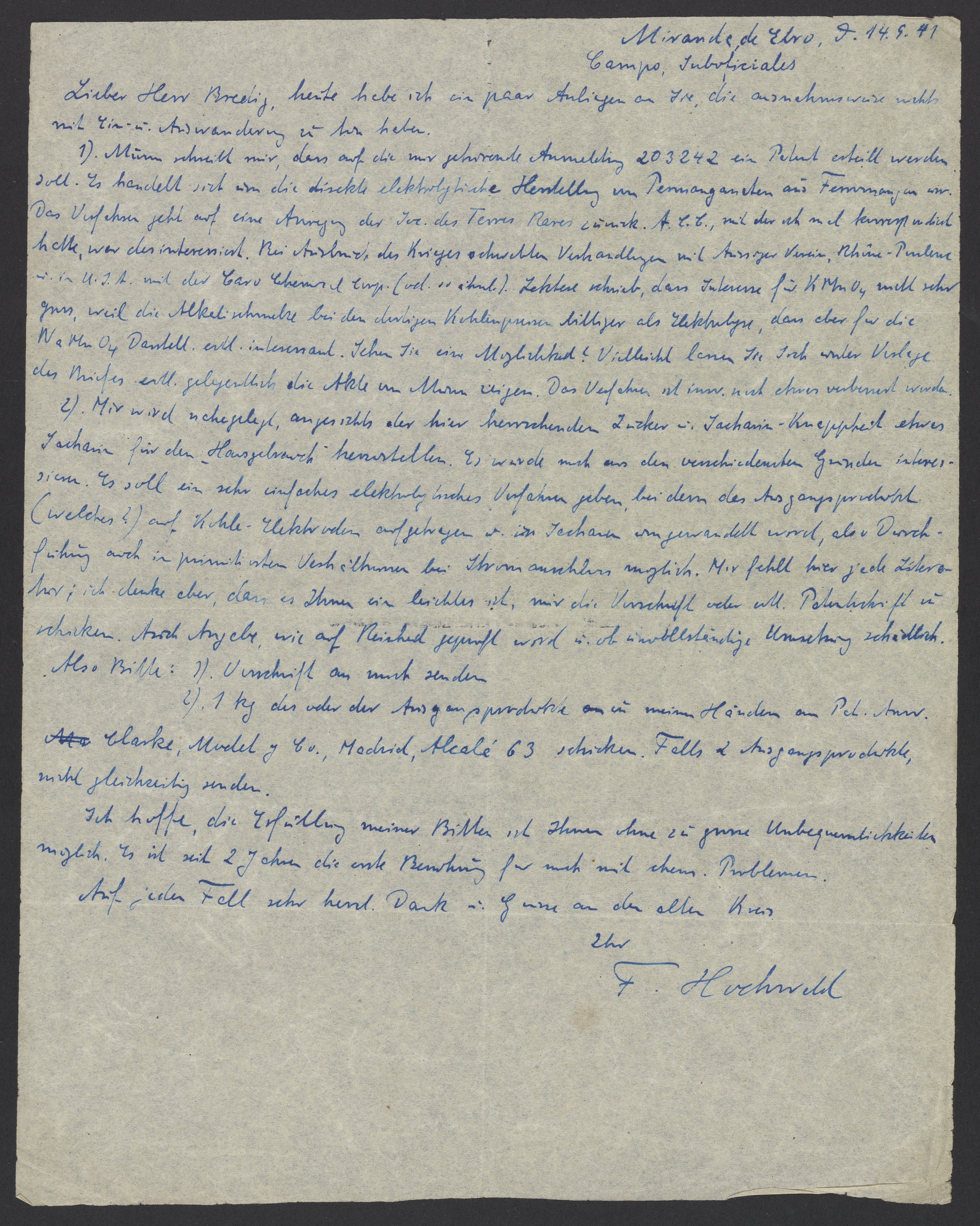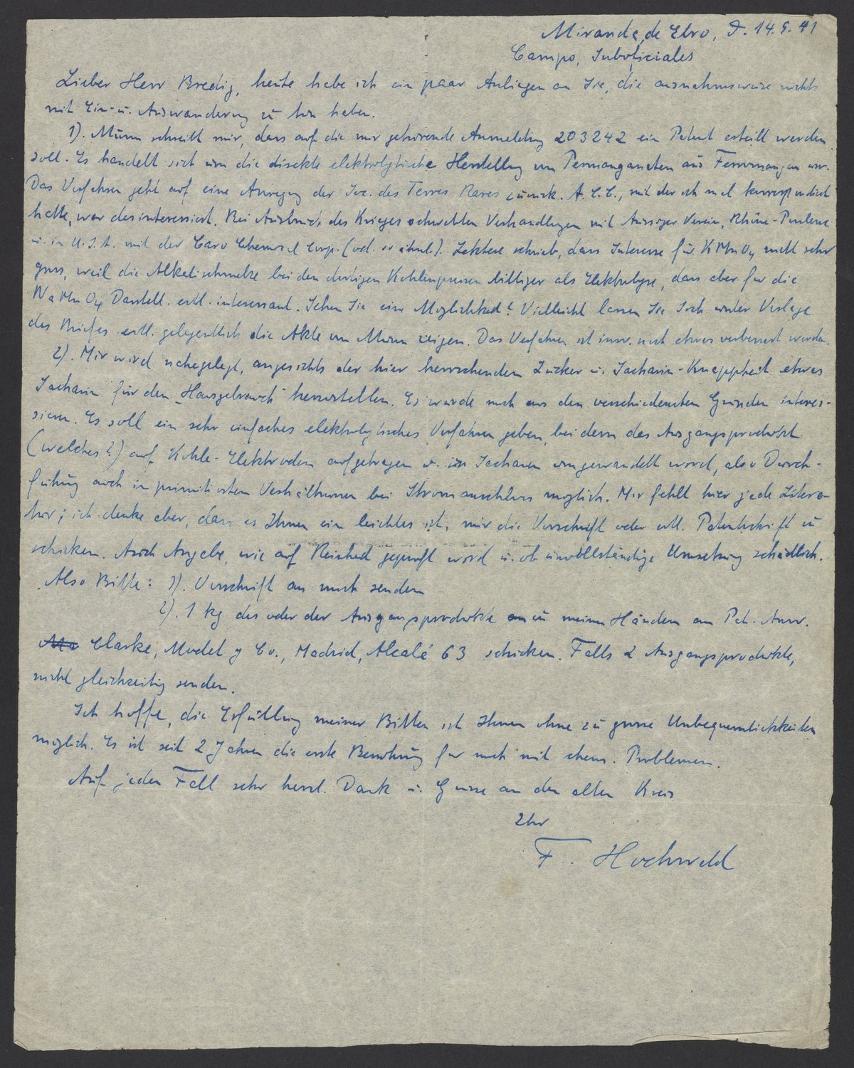 Fritz Hochwald, a German Jewish patent specialist who is interned in the Miranda de Ebro concentration camp in Spain, writes to his former colleague, Max Bredig (1902-1977) for assistance that is not related to his American immigration application. He first requests that Bredig inquire with his attorney, Mr. Munn, on the progress of his patent application for the direct electrolytic production of permanganates from ferromanganese. He then asks Bredig to send him supplies to conduct an experiment with saccharin.