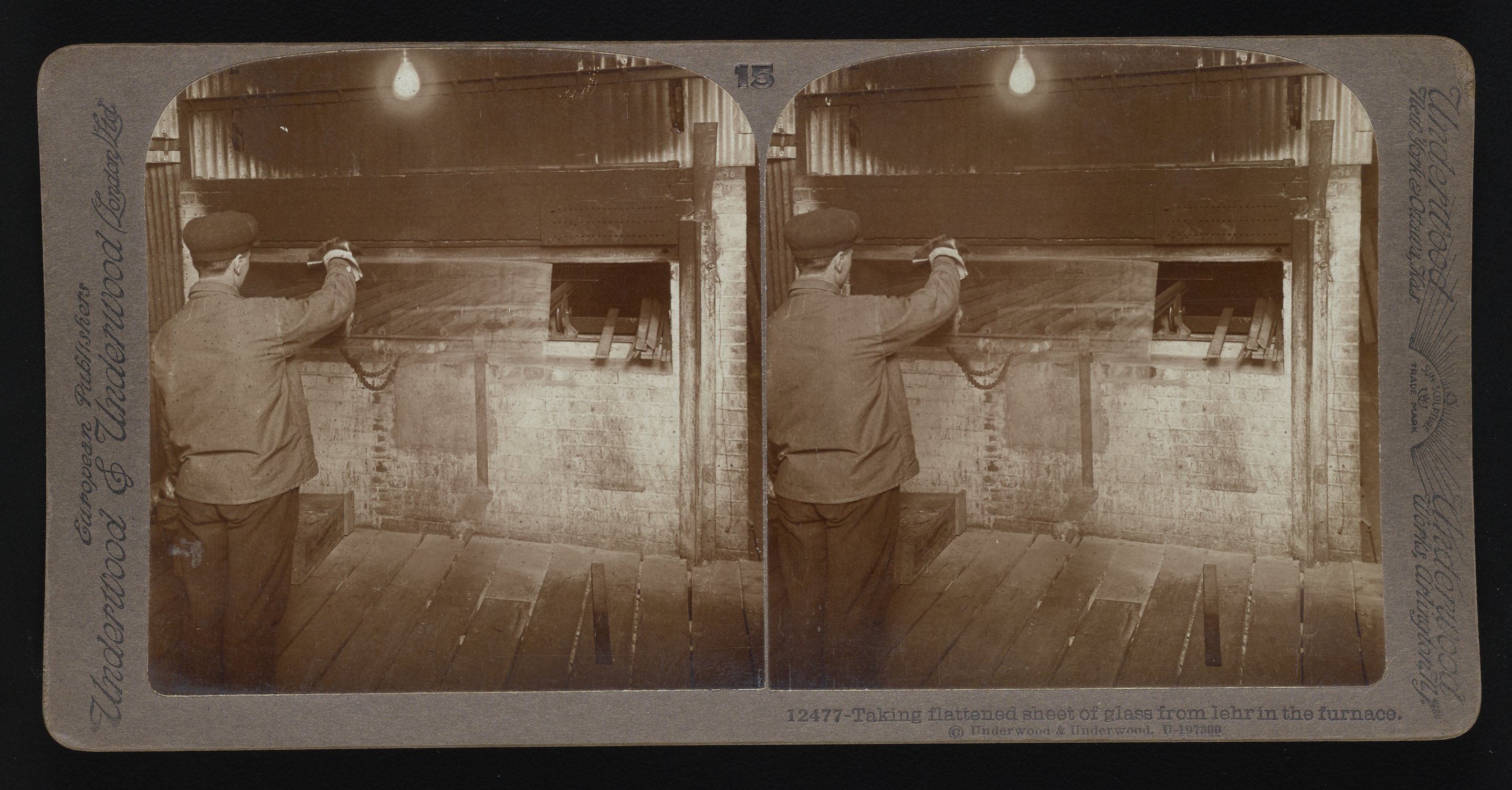 “Taking Flattened Sheet of Glass from Lehr in the Furnace.” Underwood & Underwood, n.d. Underwood & Underwood Stereographs of Manufacturing Industries. Science History Institute. Philadelphia. https://digital.sciencehistory.org/works/dv13zt216.