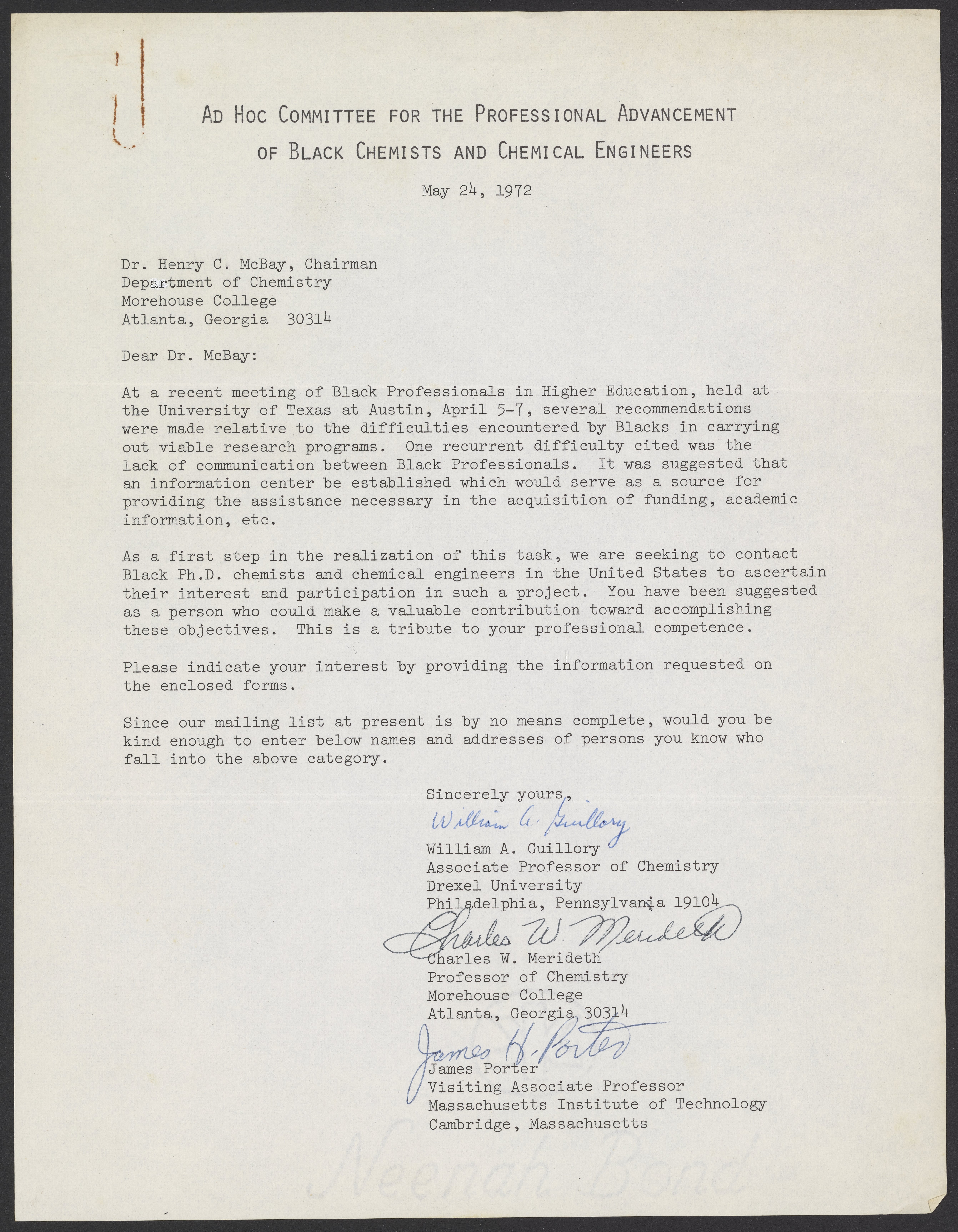 Letter from the Committee for the Professional Advancement of Black Chemists to Henry McBay