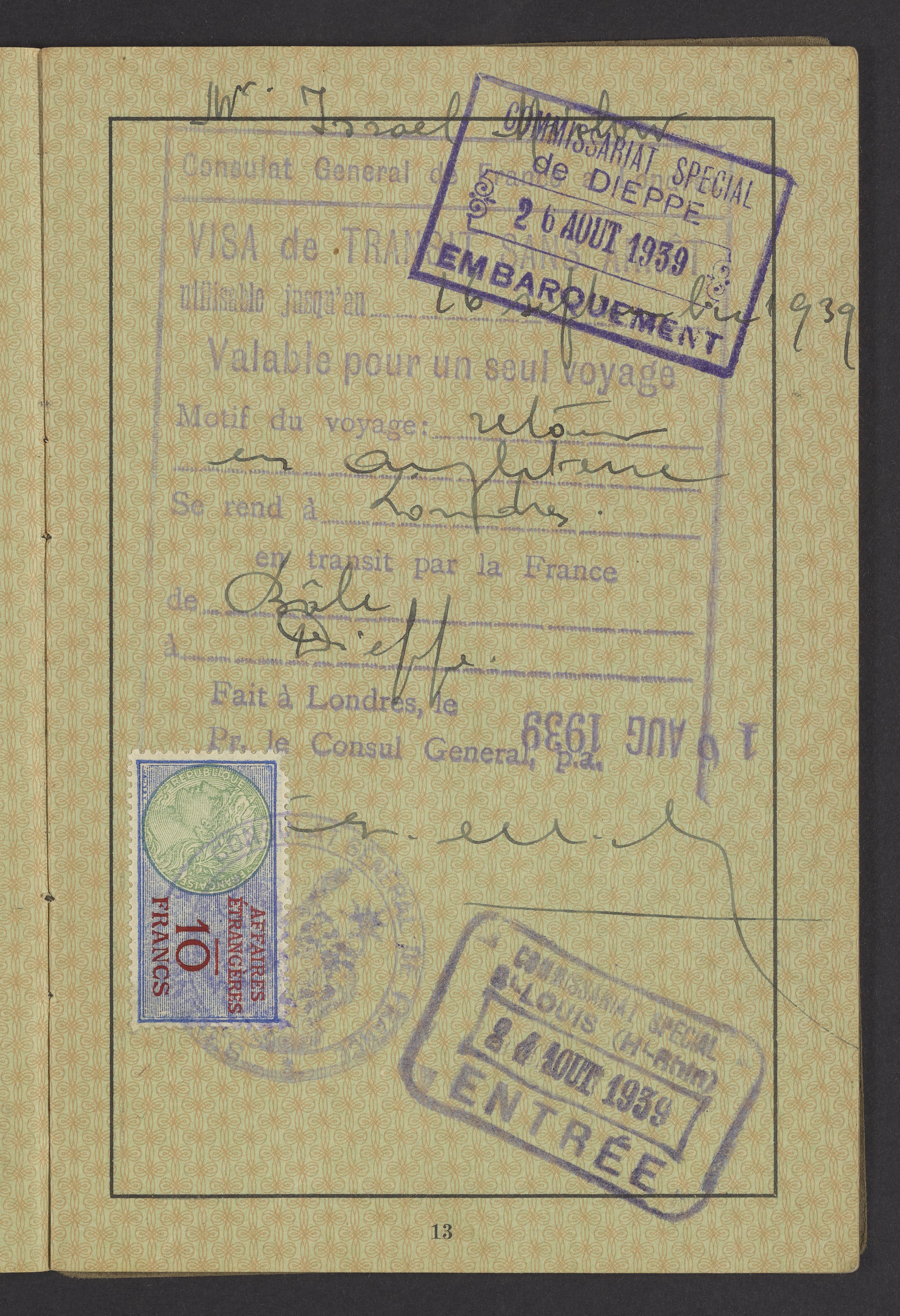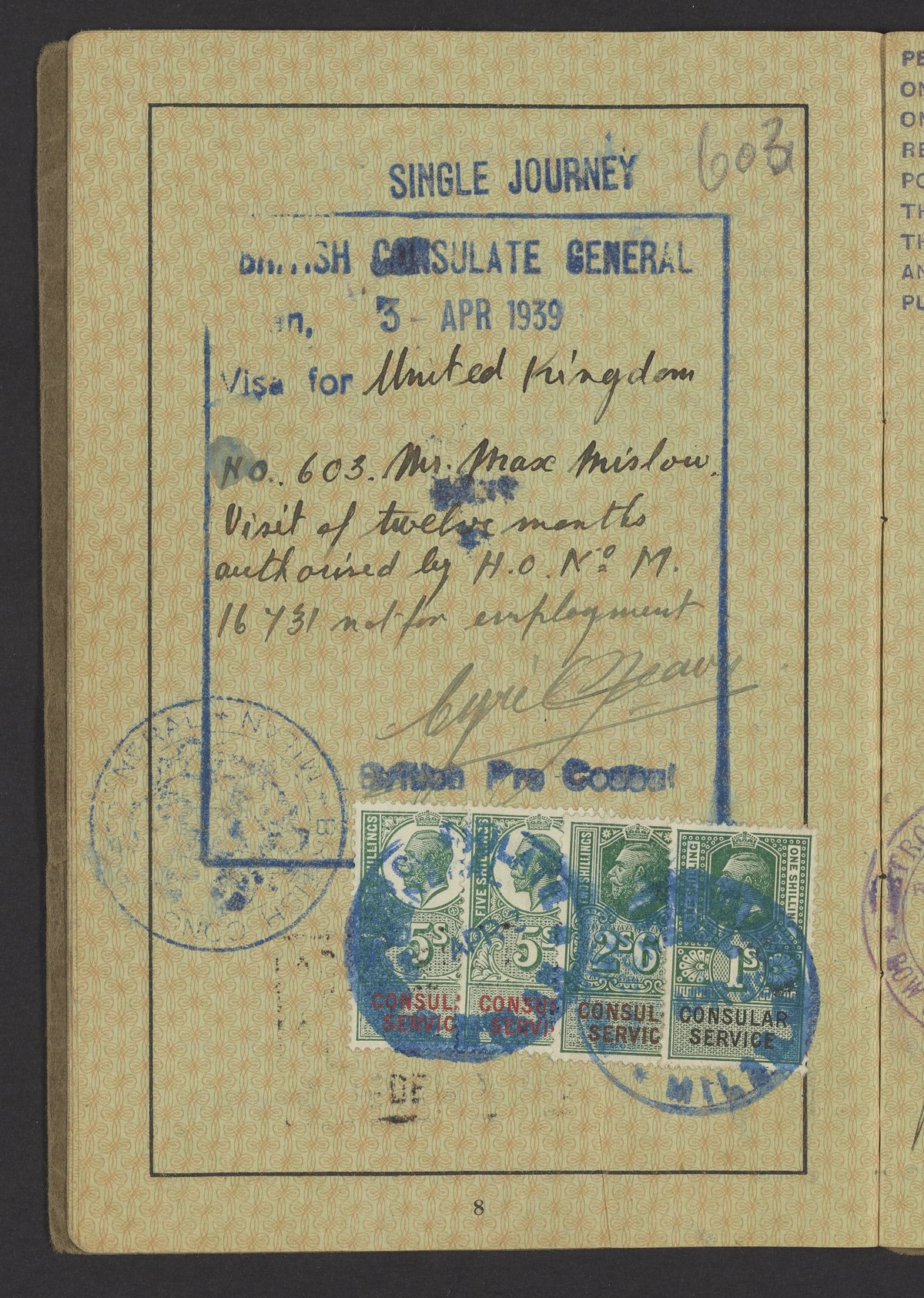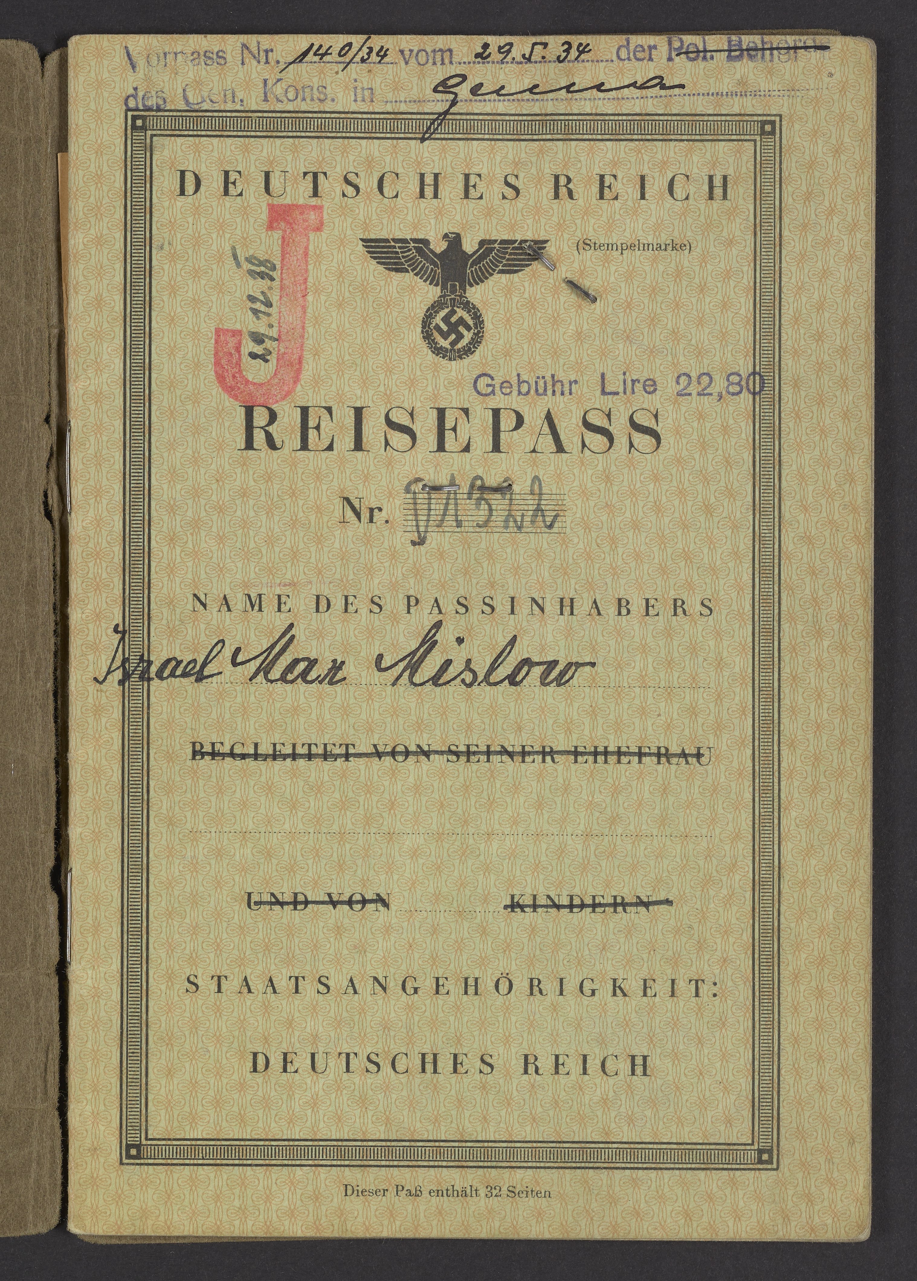 At this time in Germany, Jewish Germans and stateless Jews were allowed to use only Hebrew first names and family names issued by the Reich Minister of the Interior. If they didn't choose a new Hebrew name, men were assigned the name Israel and women, Sarah. Failure to take these names was punishable by imprisonment. The first page of the passport lists Max's name as "Israel Max Mislow," possibly because of the forcible assignment of Jewish names.