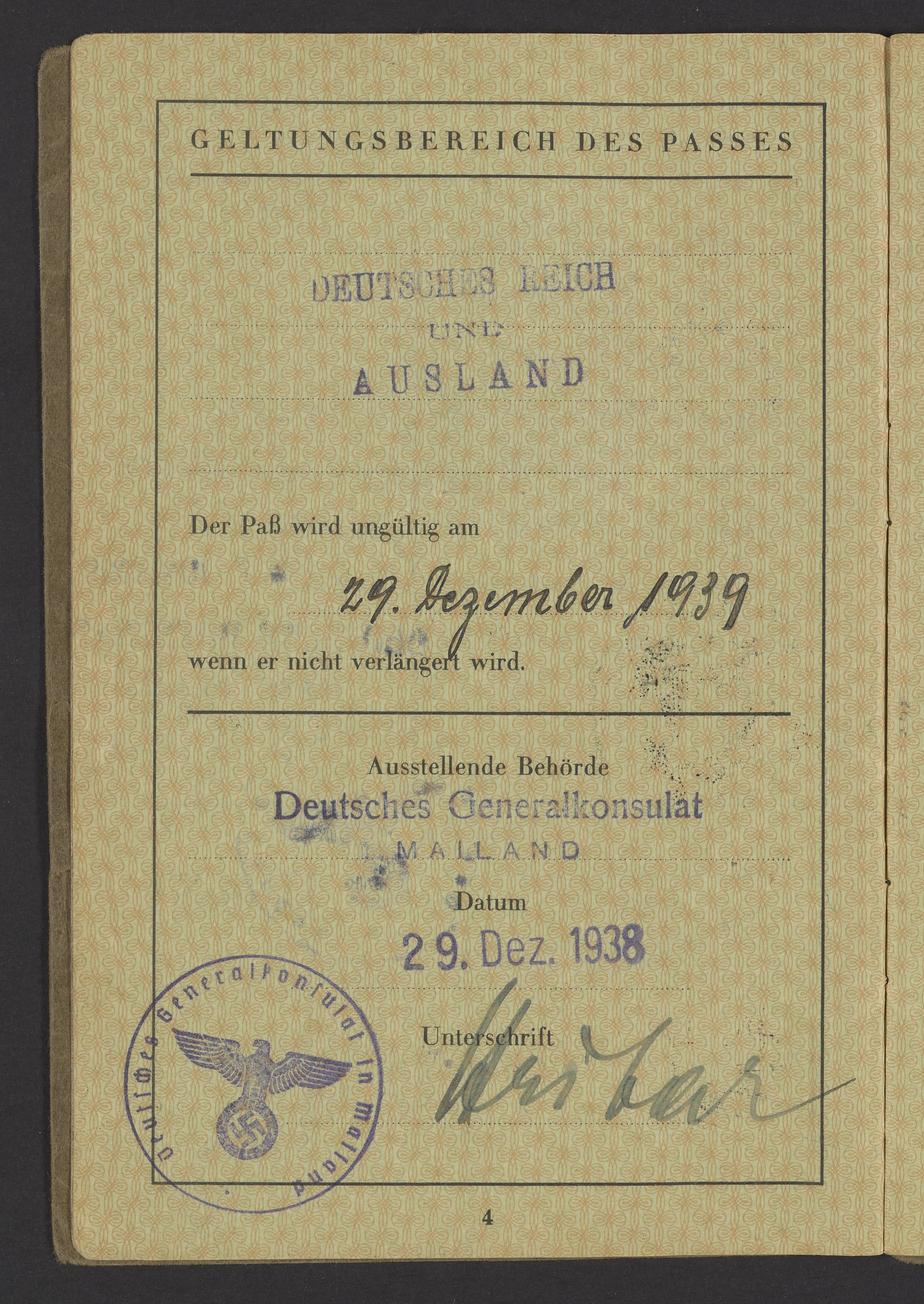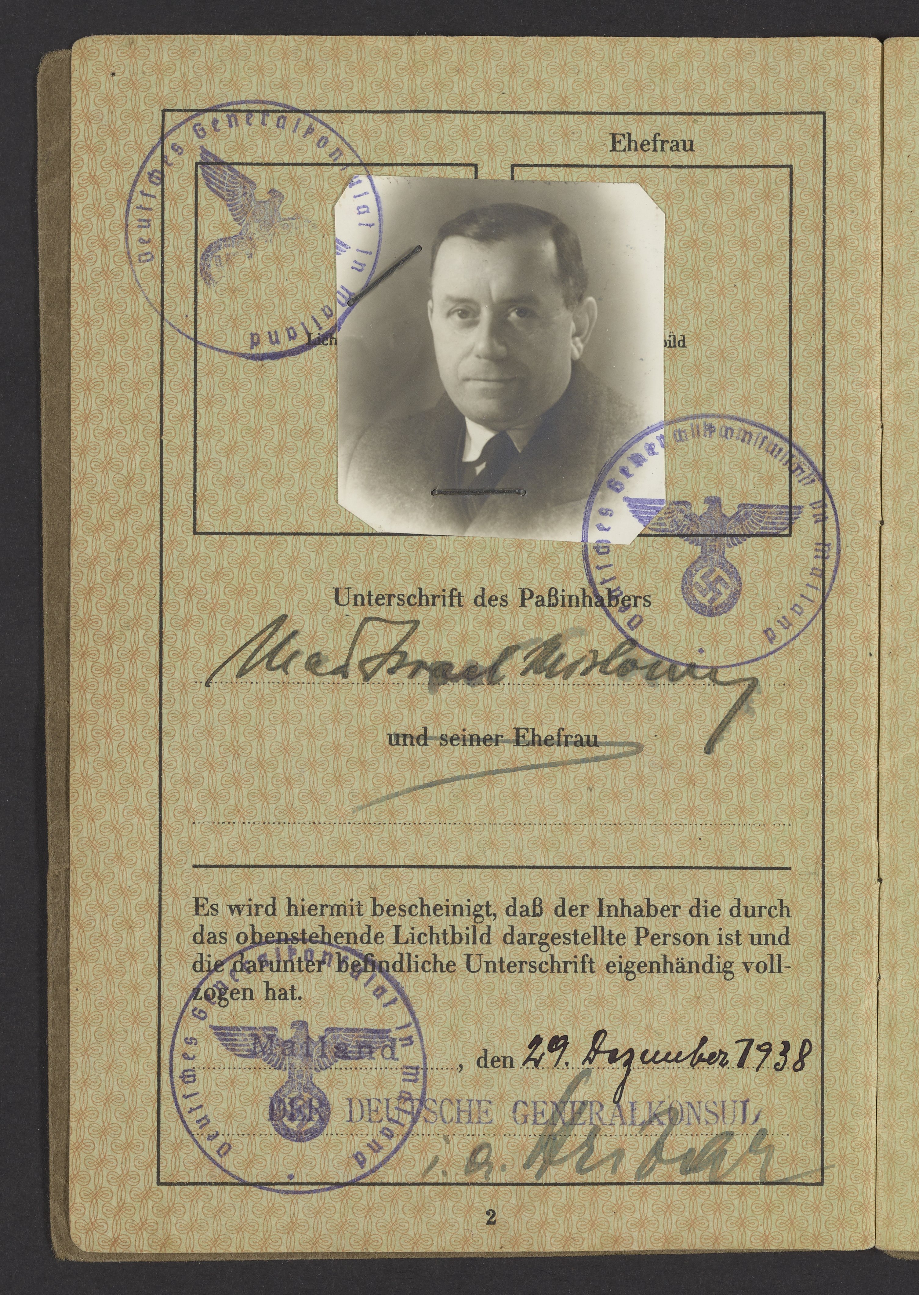 Germany. Generalkonsulat (Milan, Italy). “Max Mislow's German Reich Passport,” 1938. Kurt M. Mislow Papers, Box 21, Folder 58. Science History Institute. Philadelphia. https://digital.sciencehistory.org/works/dyefjvc.