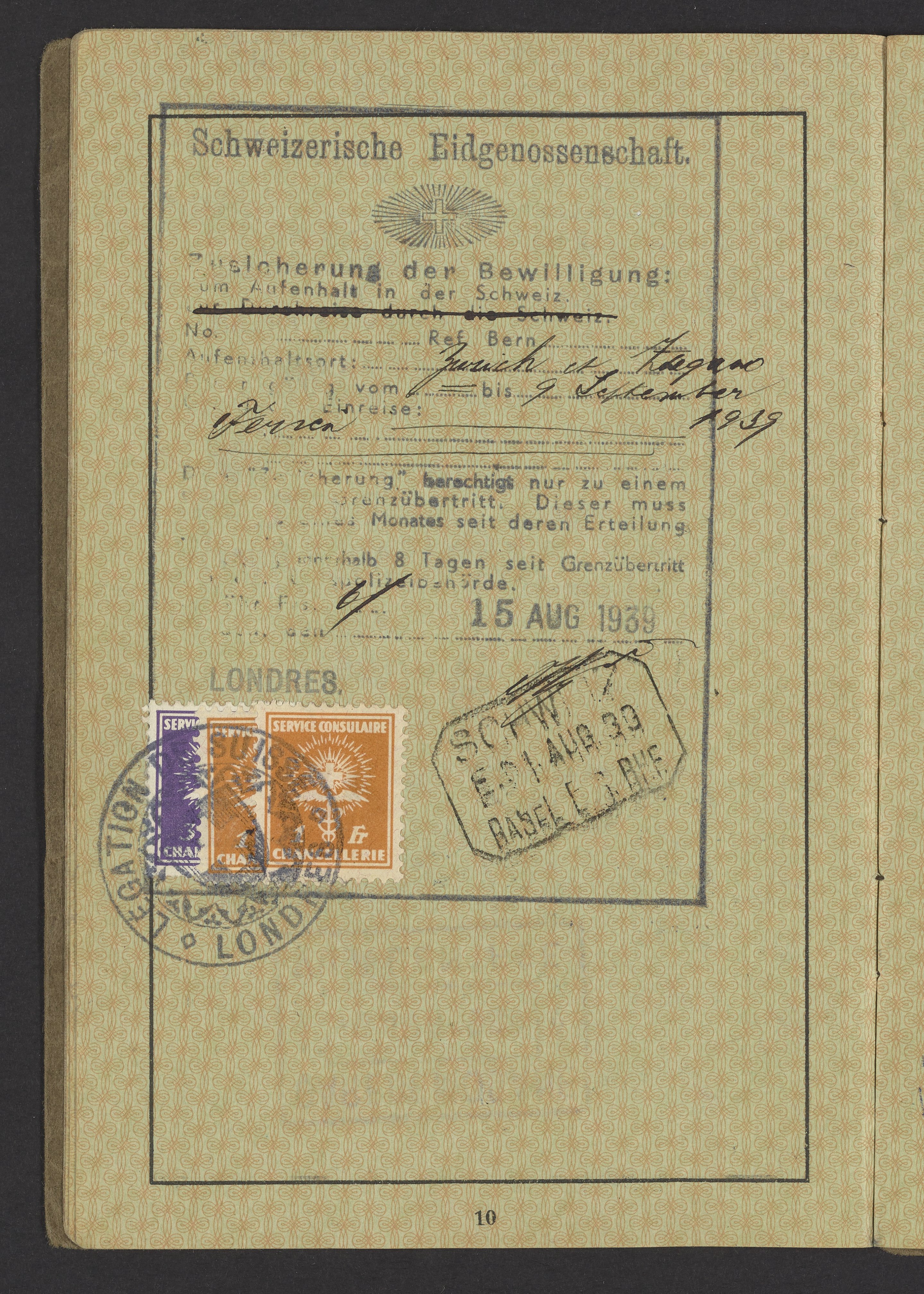 At this time in Germany, Jewish Germans and stateless Jews were allowed to use only Hebrew first names and family names issued by the Reich Minister of the Interior. If they didn't choose a new Hebrew name, men were assigned the name Israel and women, Sarah. Failure to take these names was punishable by imprisonment. The first page of the passport lists Max's name as "Israel Max Mislow," possibly because of the forcible assignment of Jewish names.