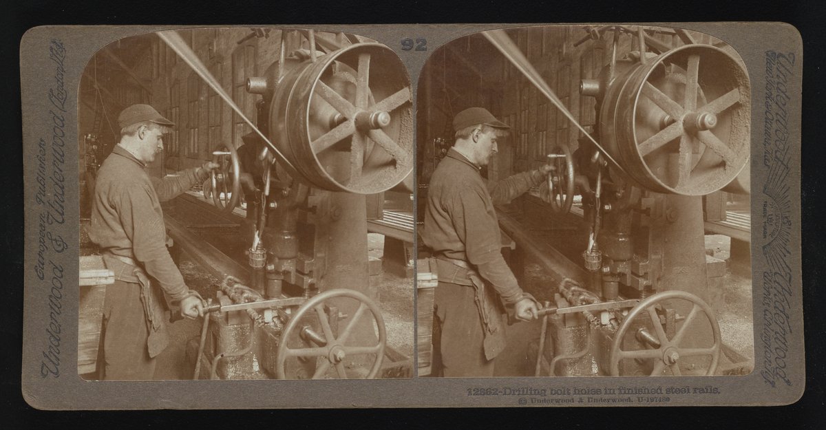 “Drilling Bolt Holes in Finished Steel Rails.” Underwood & Underwood, n.d. Underwood & Underwood Stereographs of Manufacturing Industries. Science History Institute. Philadelphia. https://digital.sciencehistory.org/works/dz010q04x.
