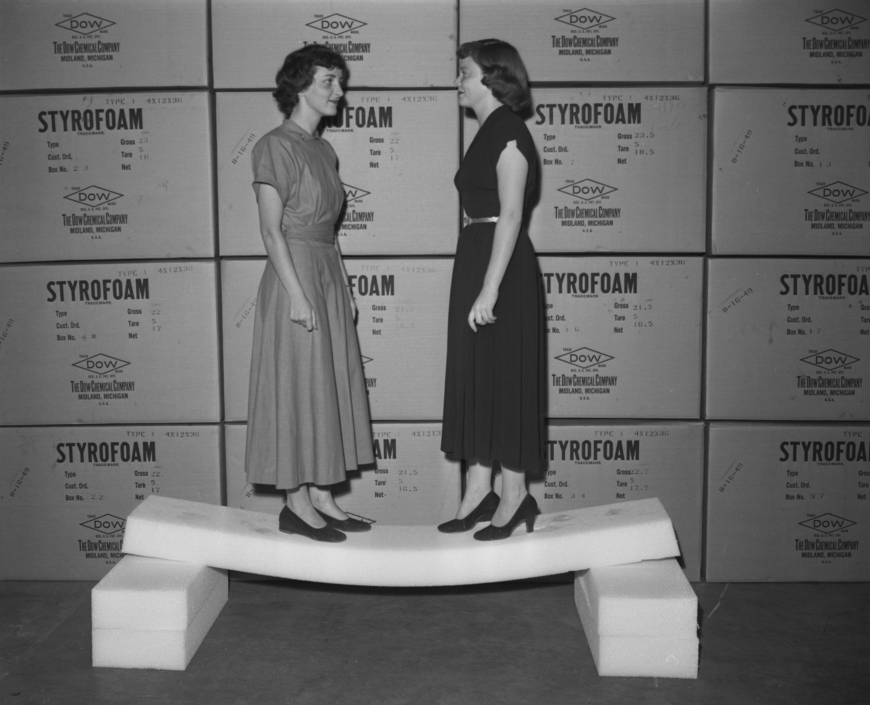 View of two female models standing on a plank of Dow Chemical Company Styrofoam to demonstrate the product's sturdiness and durability. Several boxes of Styrofoam products are visible in the background.