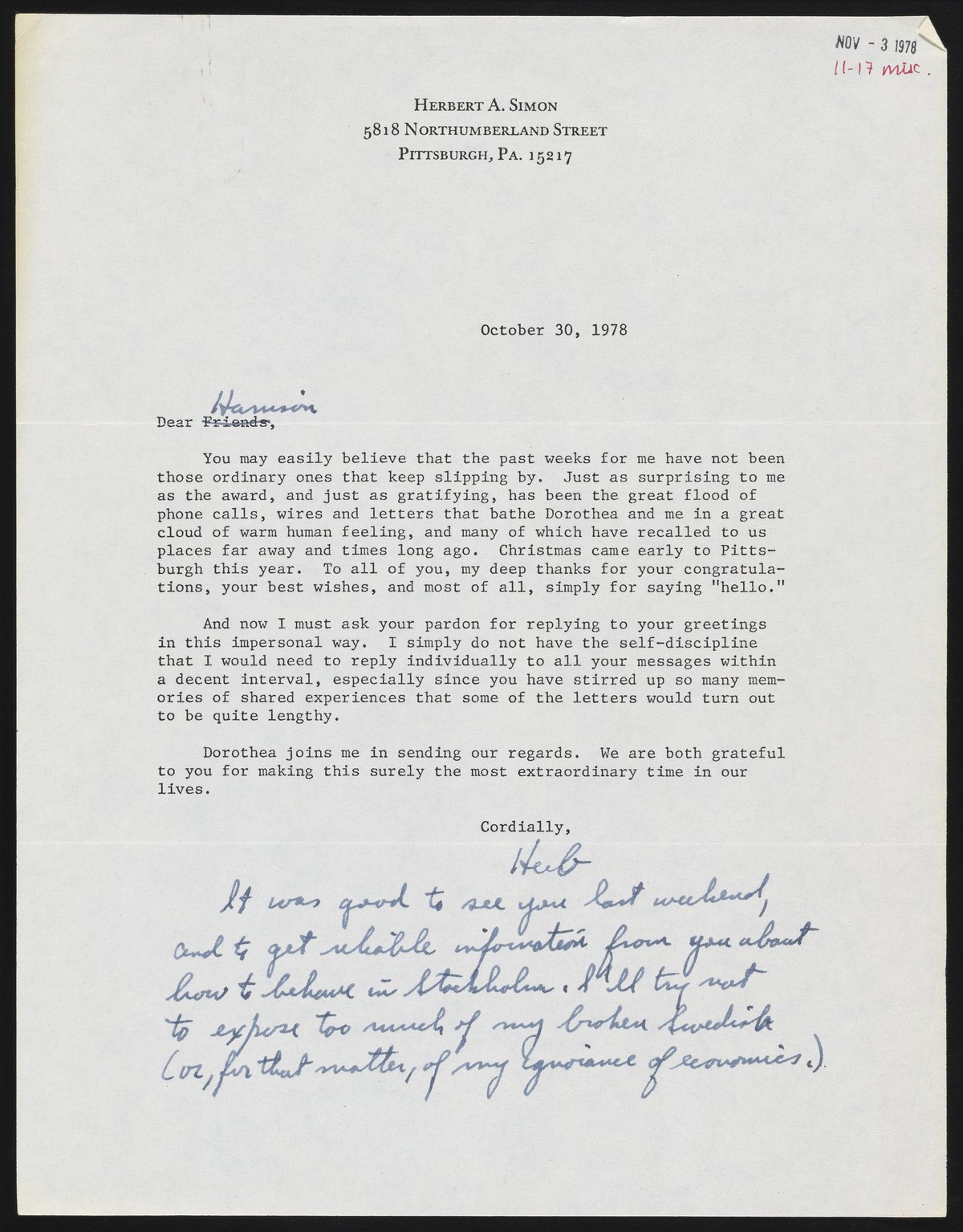 Acknowledgement of congratulatory note on the occasion of Simon being awarded the 1978 Nobel Prize in Economics.