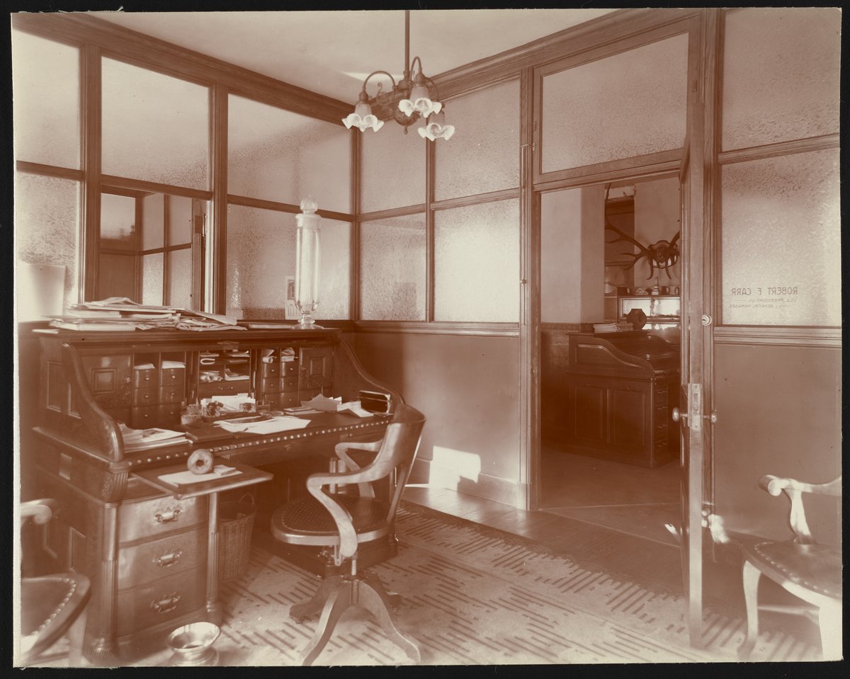 General view of the office of Vice President and General Manager Robert F. Carr at the Dearborn Drug and Chemical Works (later Dearborn Chemical Company) 35th Street laboratory facilities located in Chicago, Illinois. Founded in 1887, the Dearborn Chemical Company was a corporate ancestor of BetzDearborn, Incorporated best known for manufacturing water treatment chemicals for use in boilers, cooling towers, and steam locomotives.