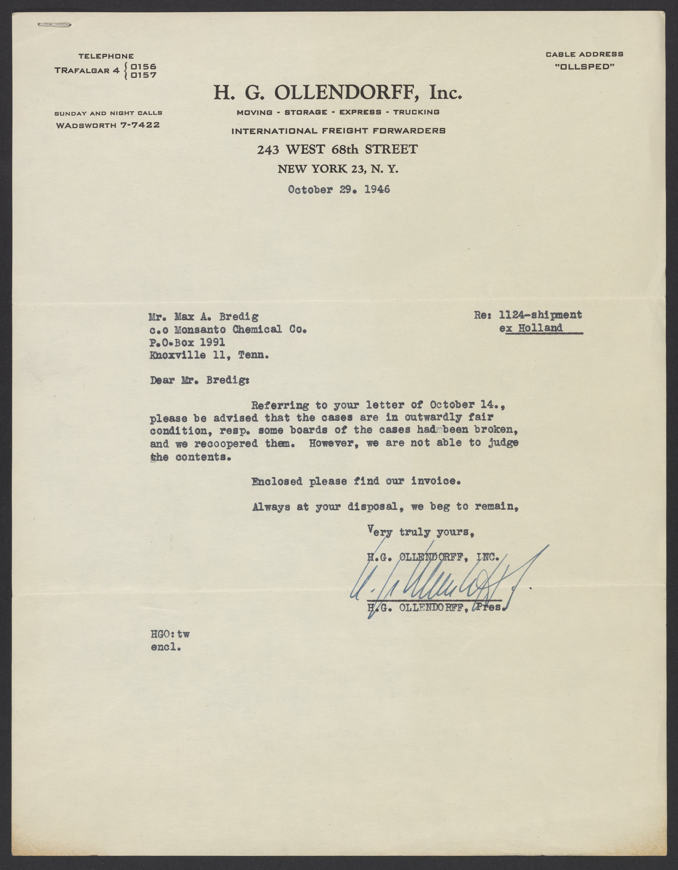 A letter from shipping company H. G. Ollendorff Inc., to Max Bredig (1902-1977) providing information on the condition of Bredig's shipment as well as an invoice.