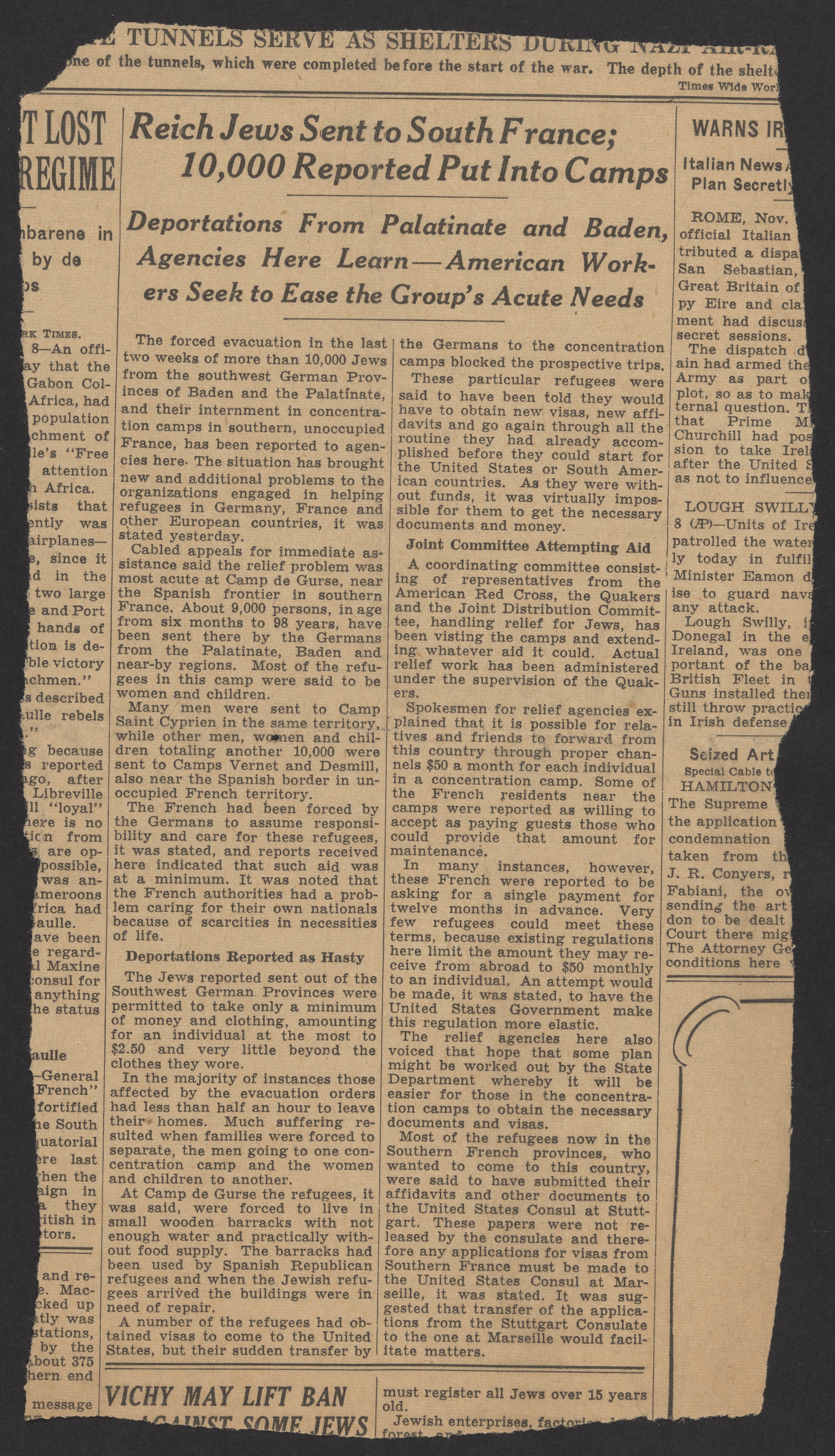 New York Times article titled Reich Jews Sent to South France; 10,000 Reported Put Into Camps; Deportations From Palatinate and Baden, Agencies Here Learn--American Workers Seek to Ease the Group's Acute Needs.