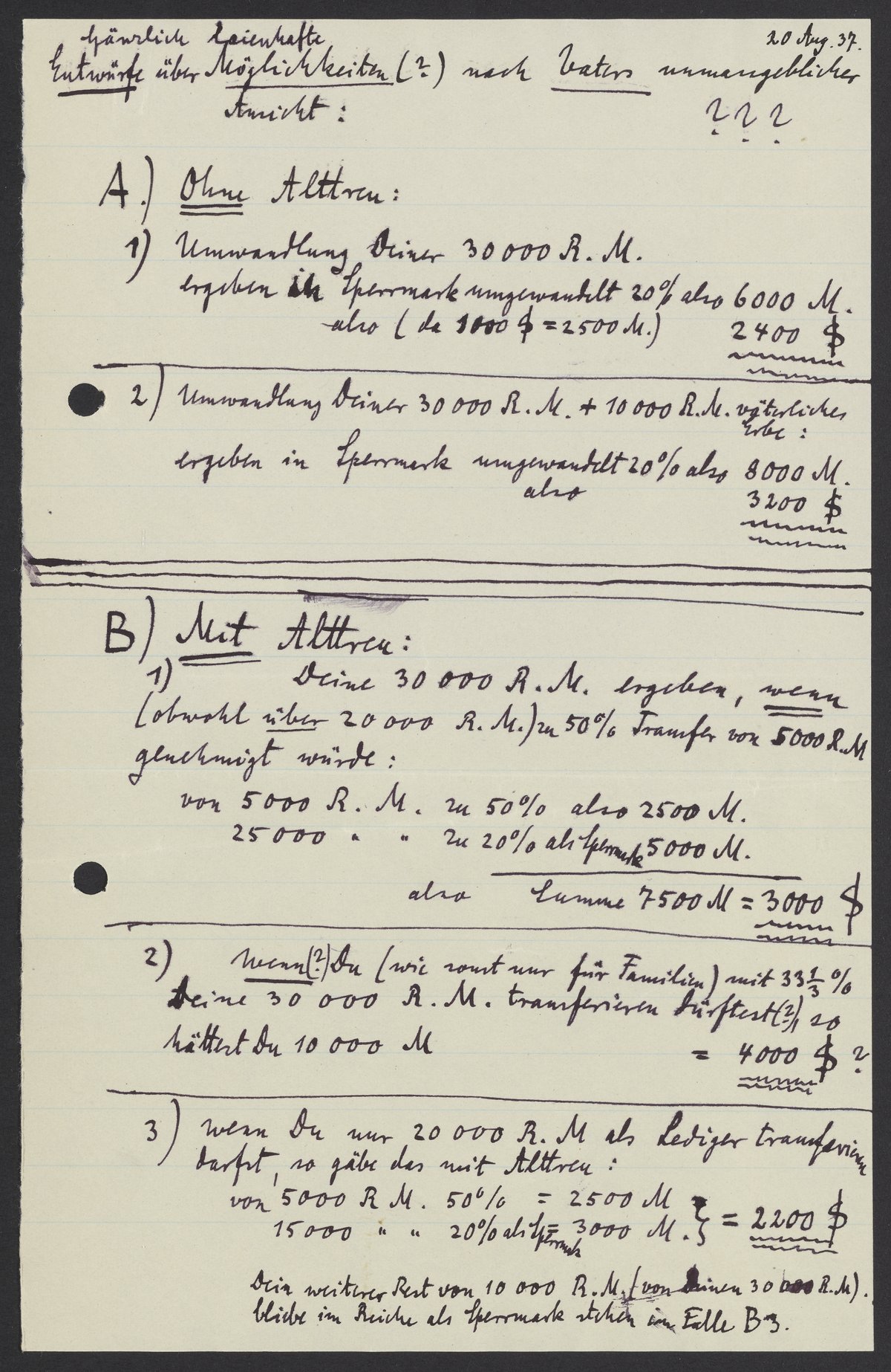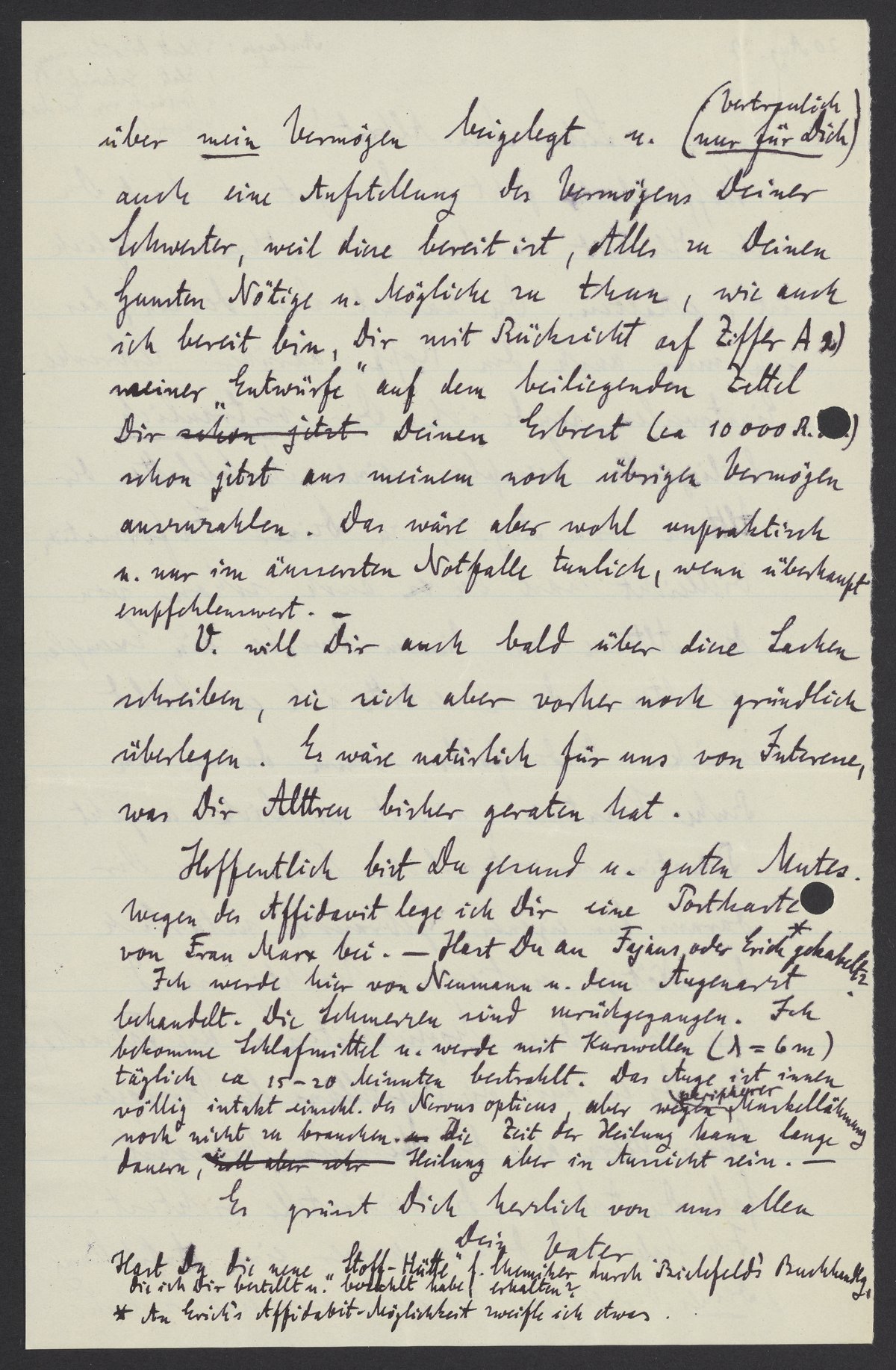 über mein Vermögen beigelegt u. (vertraulich nur fuer Dich) auch eine Aufstellung des Vermögens Deiner Schwester, weil diese bereit ist, Alles zu Deinen Gunsten Nötige u. Mögliche zu thun, wie auch ich bereit bin, Dir mit Rücksicht auf Ziffer A 2) meiner „Entwürfe“ auf dem beiliegenden Zettel Dir Deinen Erbrecht (ca 10 000 R.M.) schon jetzt aus meinem noch übrigen Vermögen auszuzahlen. Das wäre aber wohl unpraktisch u. nur im äußersten Notfalle tunlich, wenn überhaupt empfehlenswert.