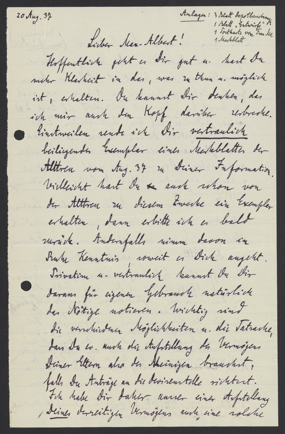 Hoffentlich geht es Dir gut u. hast Du mehr Klarheit in das, was zu thun u. möglich ist, erhalten. Du kannst Dir denken, das ich mir auch den Kopf darüber zerbreche. Einstweilen sende ich Dir vertraulich beiliegendes Exemplar eines Merkblattes der Alltreu vom Aug. 38 zu Deiner Information. Vielleicht hast Du auch schon von der Alttreu zu diesem Zwecke ein Exemplar erhalten, dann erbitte ich es bald zurück. Andernfalls nimm davon in Ruhe Kenntnis, soweit es Dich angeht. Privatim u. vertraulich kannst Du Dir daraus für eigenen Gebrauch natürlich das Nötige notieren. Wichtig sind die verschiedenen Möglichkeiten u. die Tatsache, dass Du ev. auch die Aufstellung des Vermögens Deiner Eltern also des Meinigen brauchst, falls Du Anträge an die Divisenstelle richtest. Ich habe Dir daher ausser einer Aufstellung Deines derzeitigen Vermögens auch eine solche