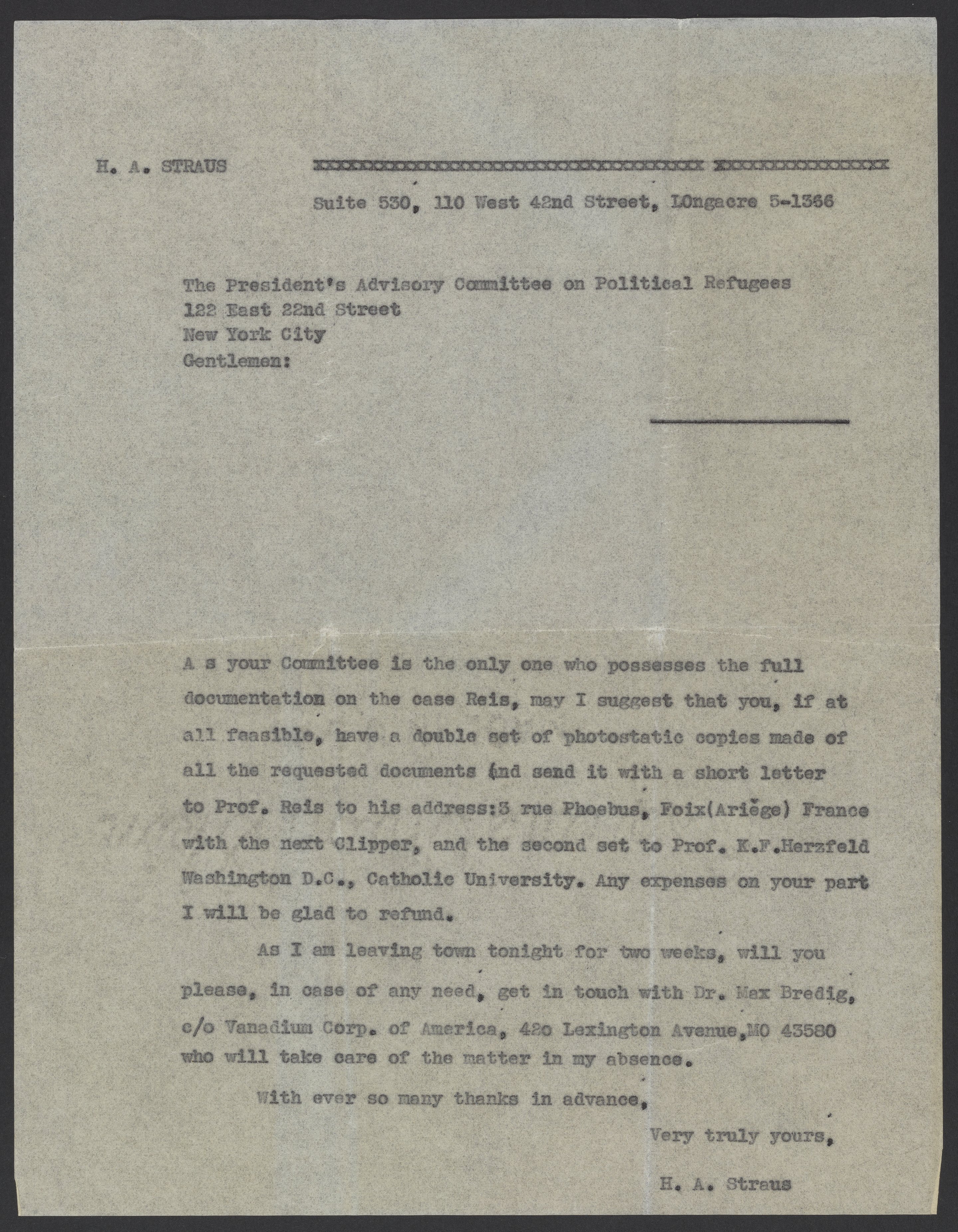 In an effort to secure the immigration of Dr. Alfred Reis (1882-1951), Hans A. Straus writes to suggest copies of Reis's immigration paperwork be sent to both Reis' French addres as well as to Professor K. F. Herzfeld of Catholic University in Washington D.C.