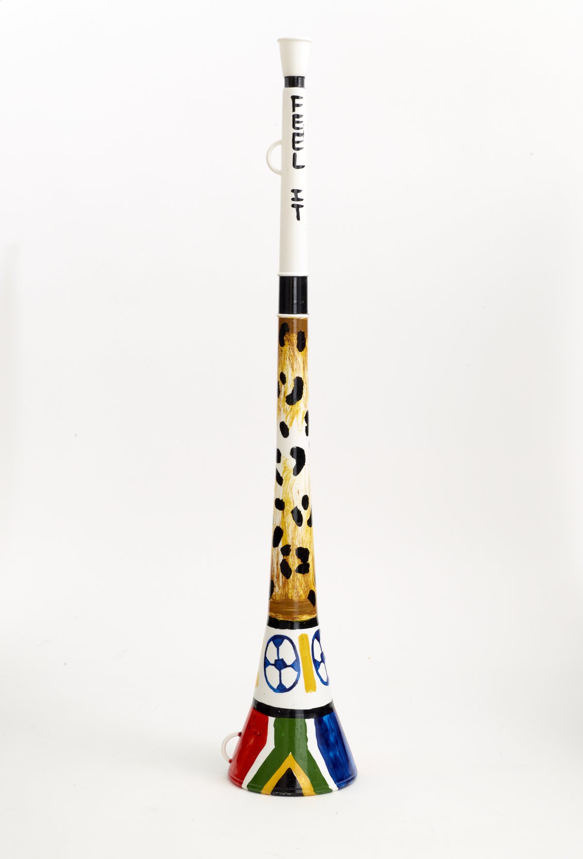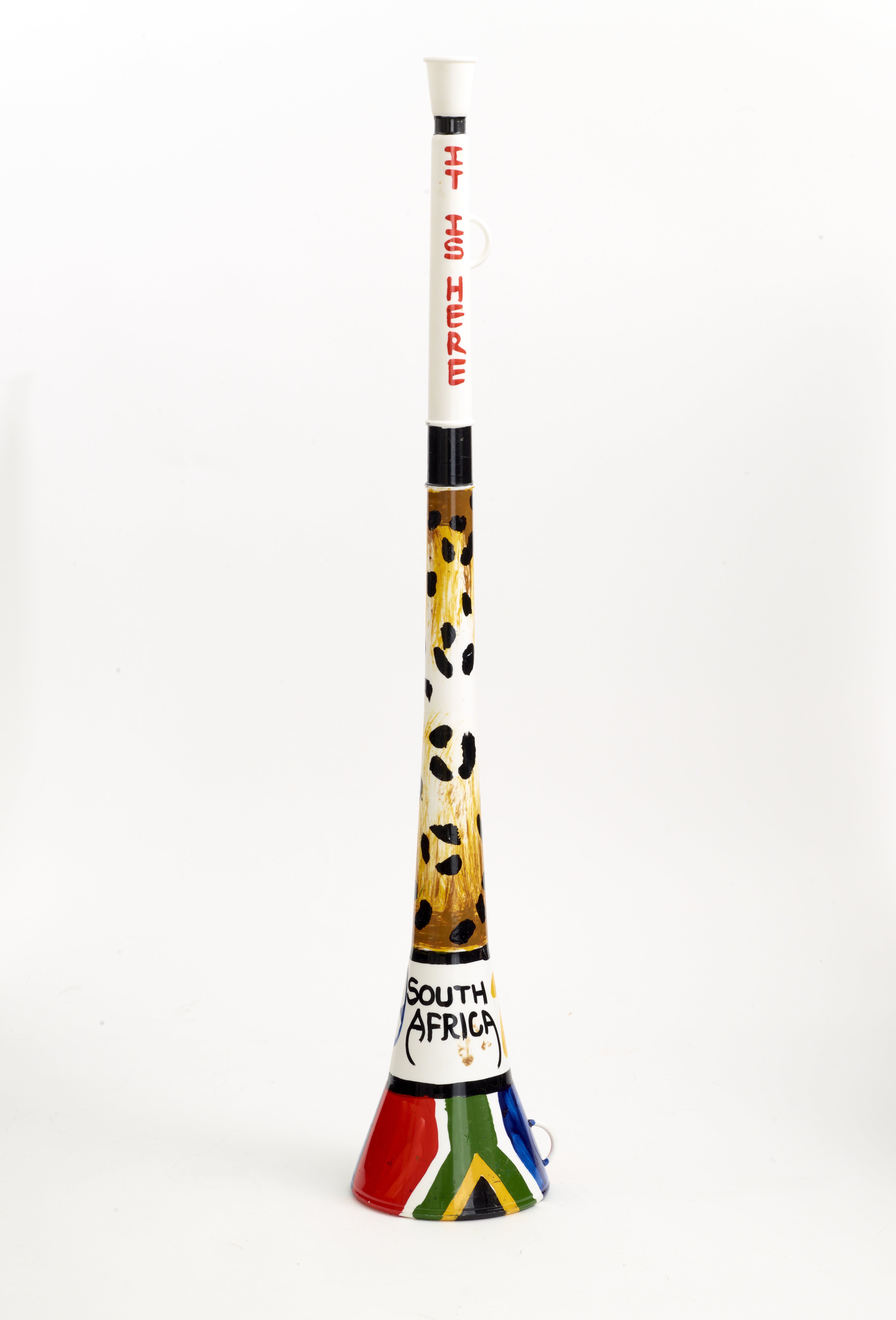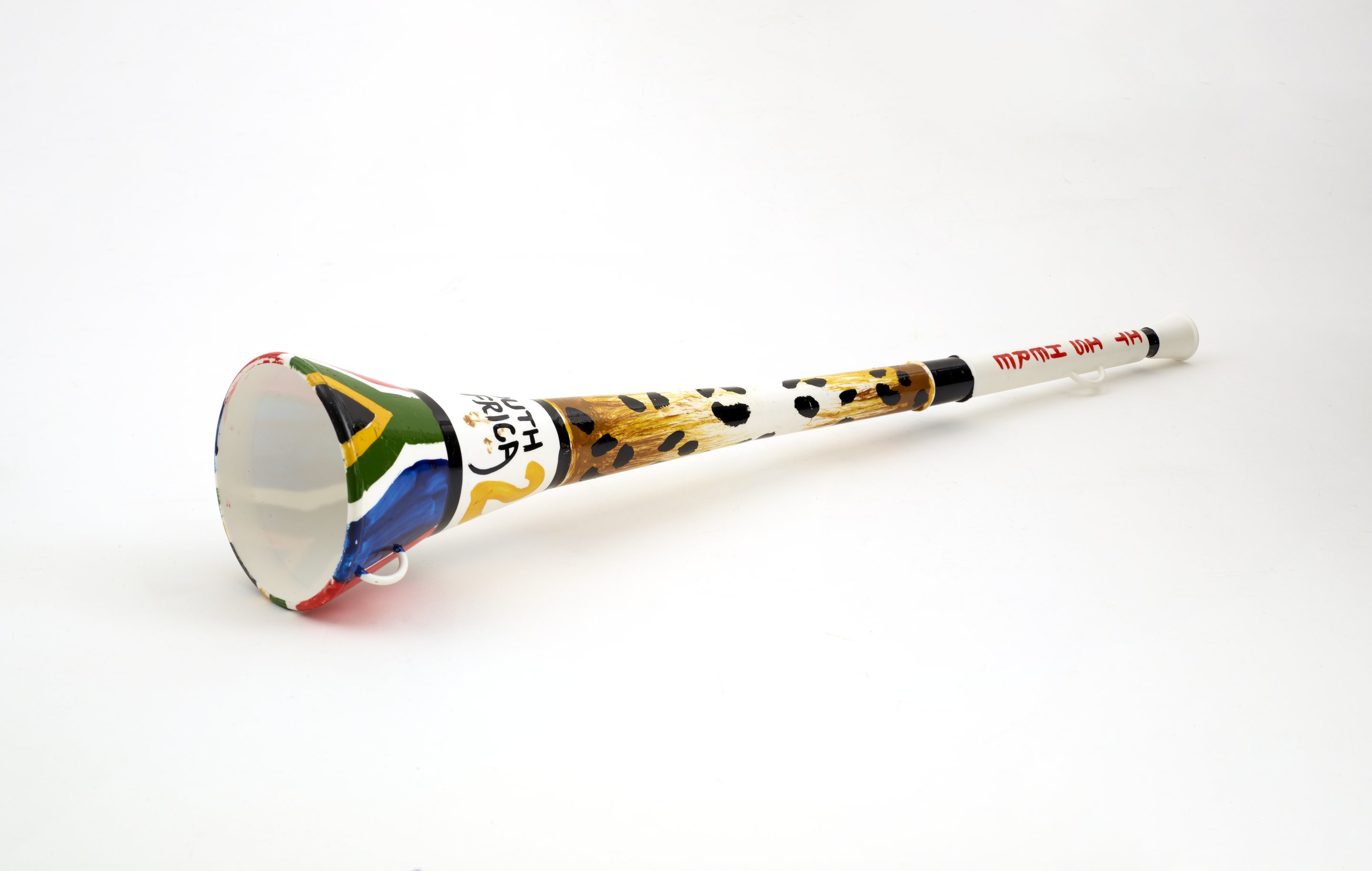 Small JPG1200 x 762px — 55.0 KBLarge JPG2880 x 1829px — 166 KBFull-sized JPG9214 x 5852px — 1.6 MBOriginal fileTIFF — 9214 x 5852px — 154 MBWhite plastic horn-shaped noise maker used by cheering fans at the 2010 Fifa World Cup held in South Africa. The vuvuzela is handpainted in multiple colors with acrylic paint. The horn's bell is decorated with the South African flag and the body is decorated with animal print.