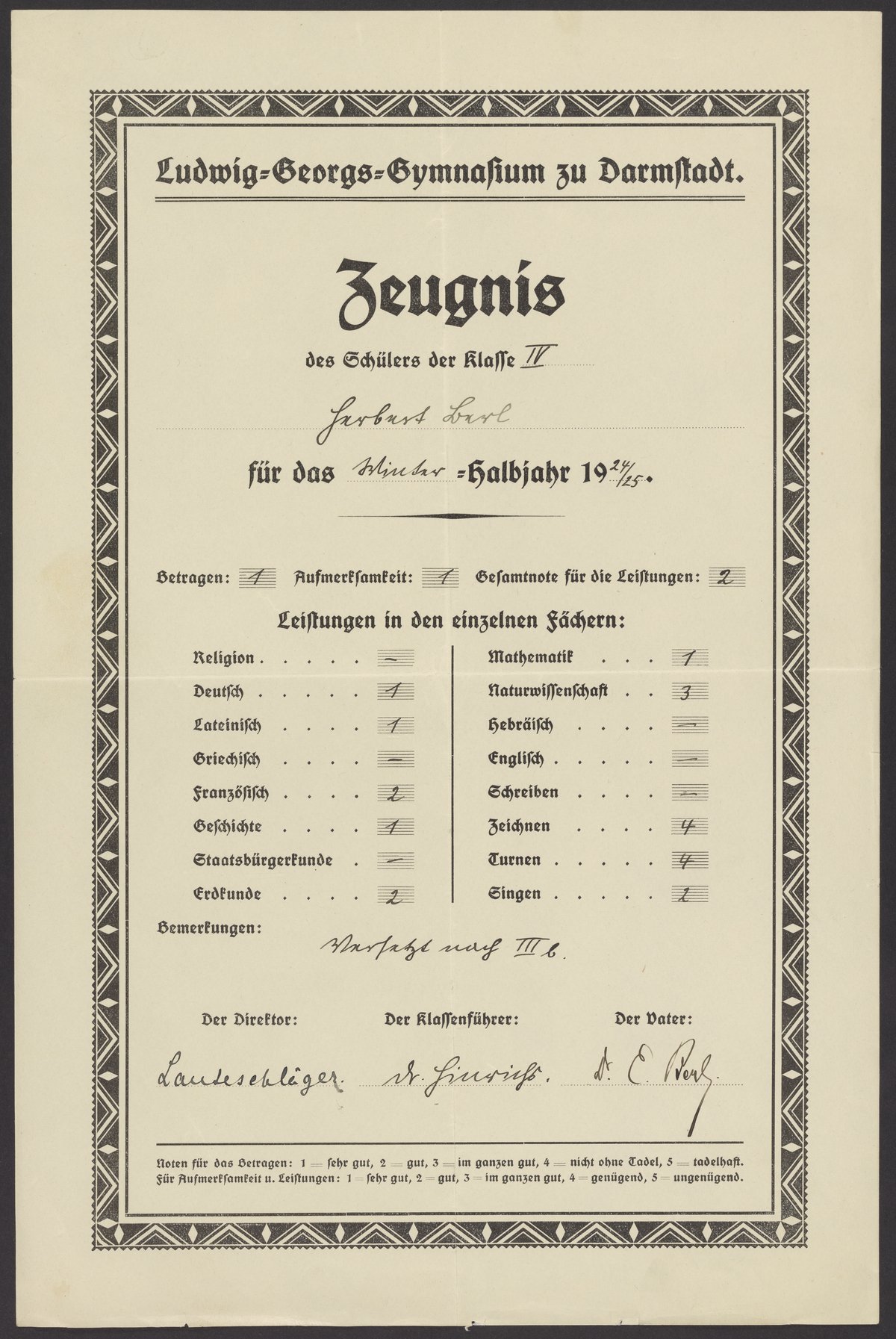 Ludwig-Georgs-Gymnasium (Darmstadt, Germany). “Herbert Berl's School Report Card, 1924-1925,” 1924–1925. Ernst Berl Papers, Box 9, Folder 8. Science History Institute. Philadelphia. https://digital.sciencehistory.org/works/ebteo0h.