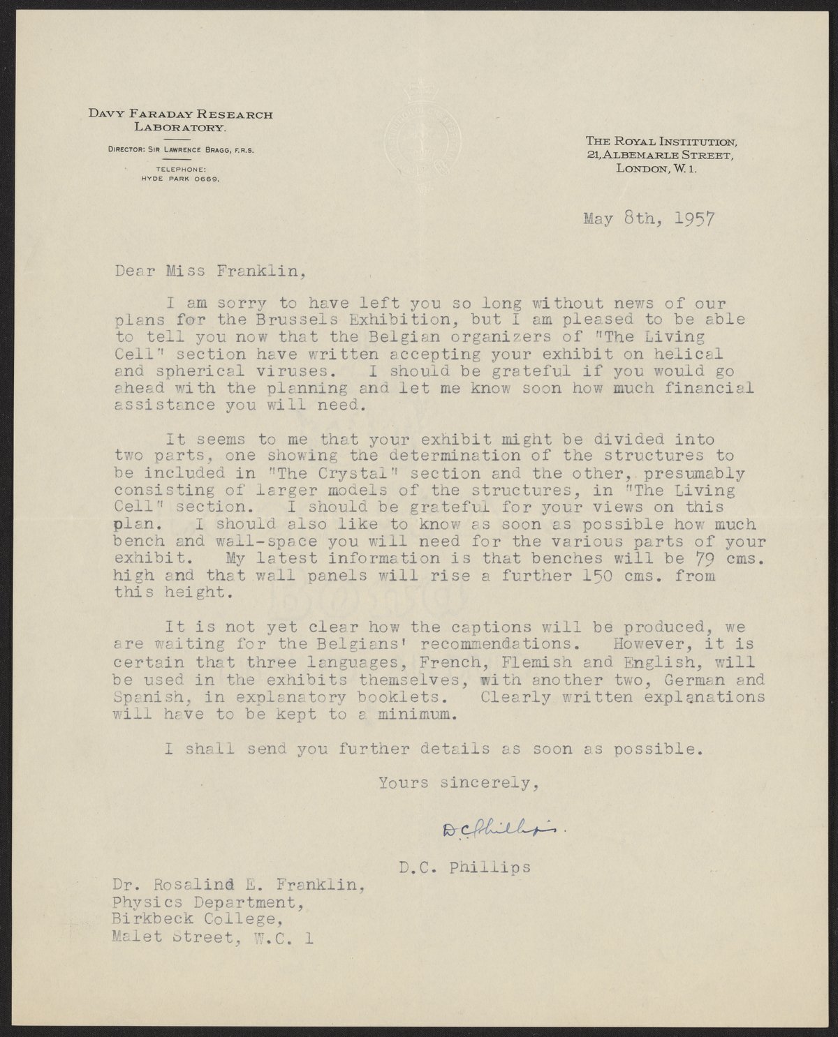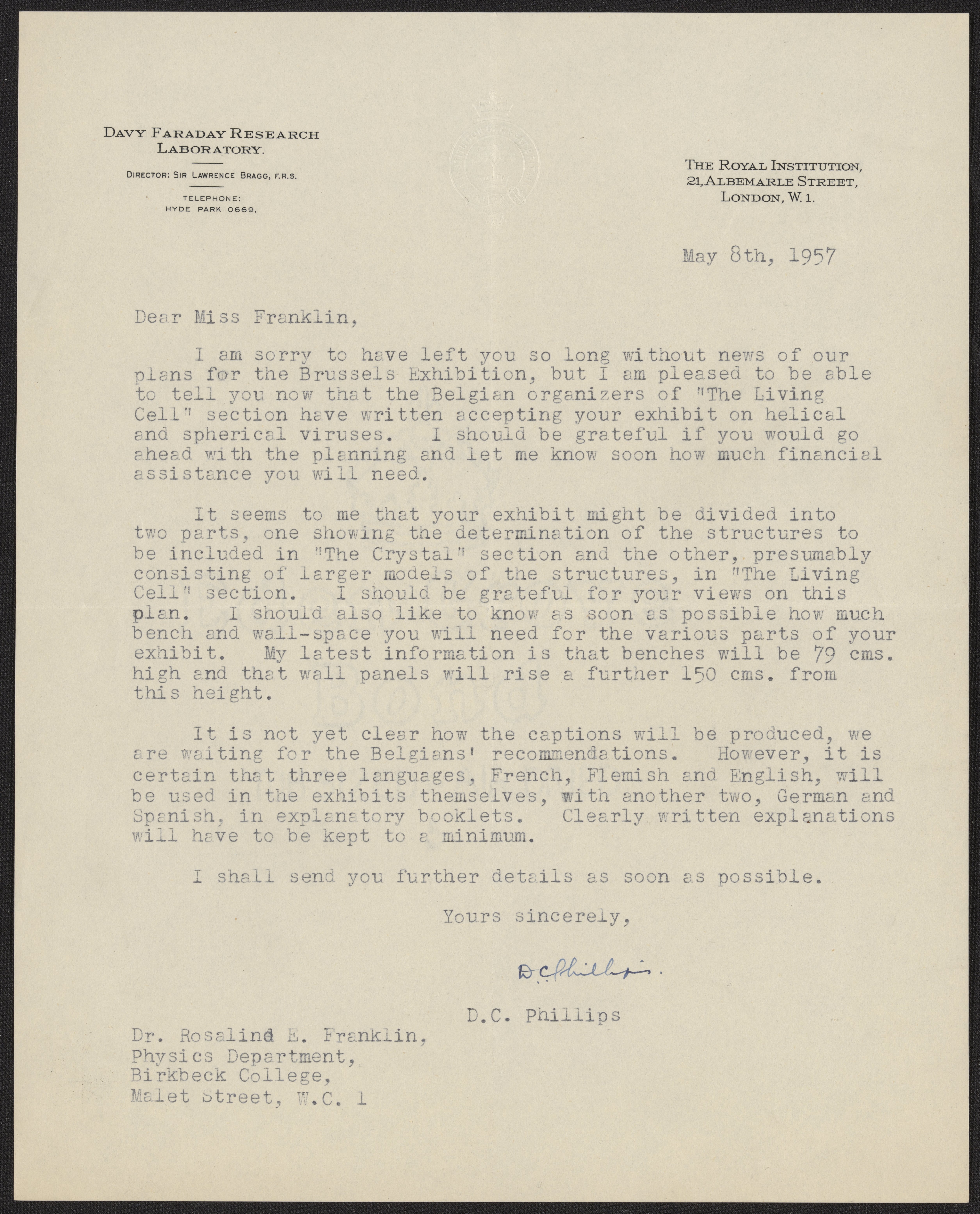 Letter from David Chilton Phillips (1924-1999) to Rosalind Franklin (1920-1958) regarding an exhibit of helical and spherical viruses to be shown at the 1958 Brussels World's Fair.
