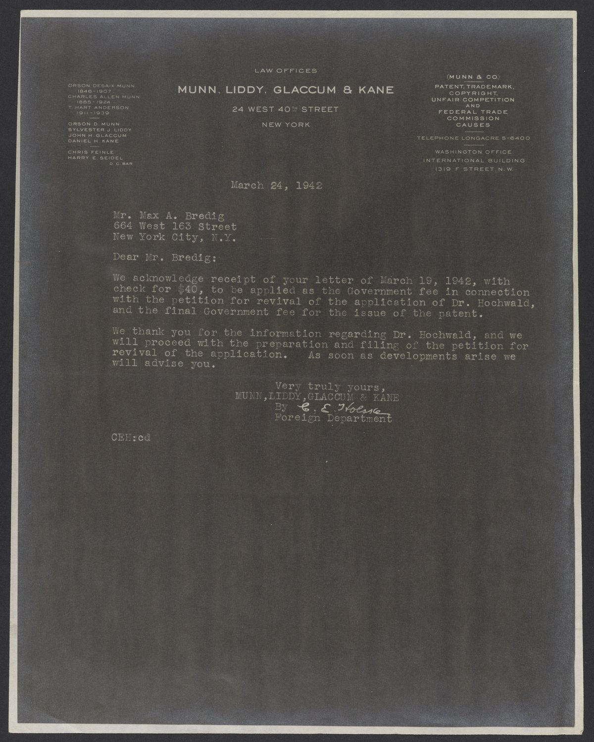 Photocopy of a letter from attorney Clarence Holske, in which he thanks Max Bredig (1902-1977) for payment of a government fee owed by Fritz Hochwald (1897-1968) for a patent application.