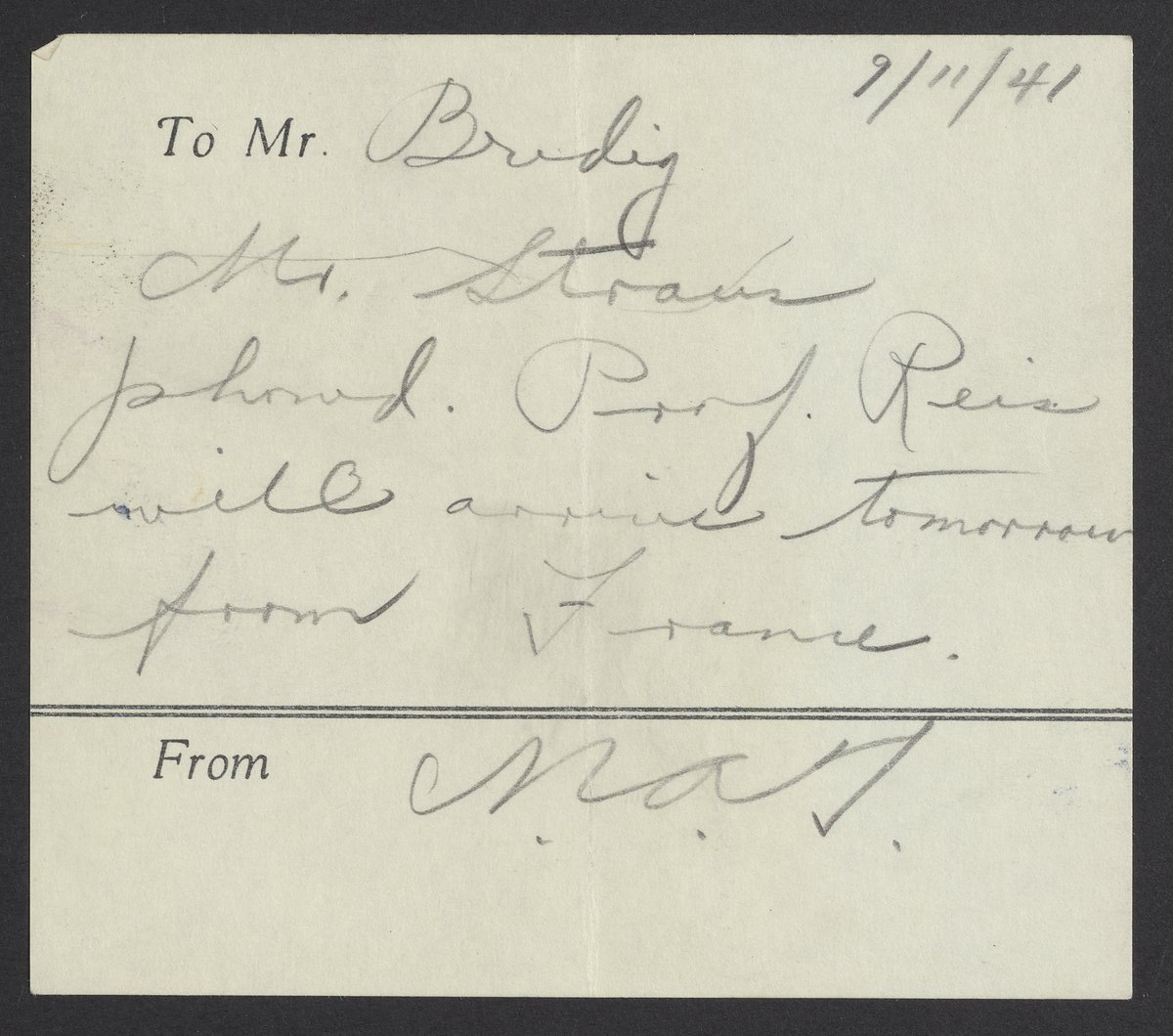 Note to Max Bredig, September 1941