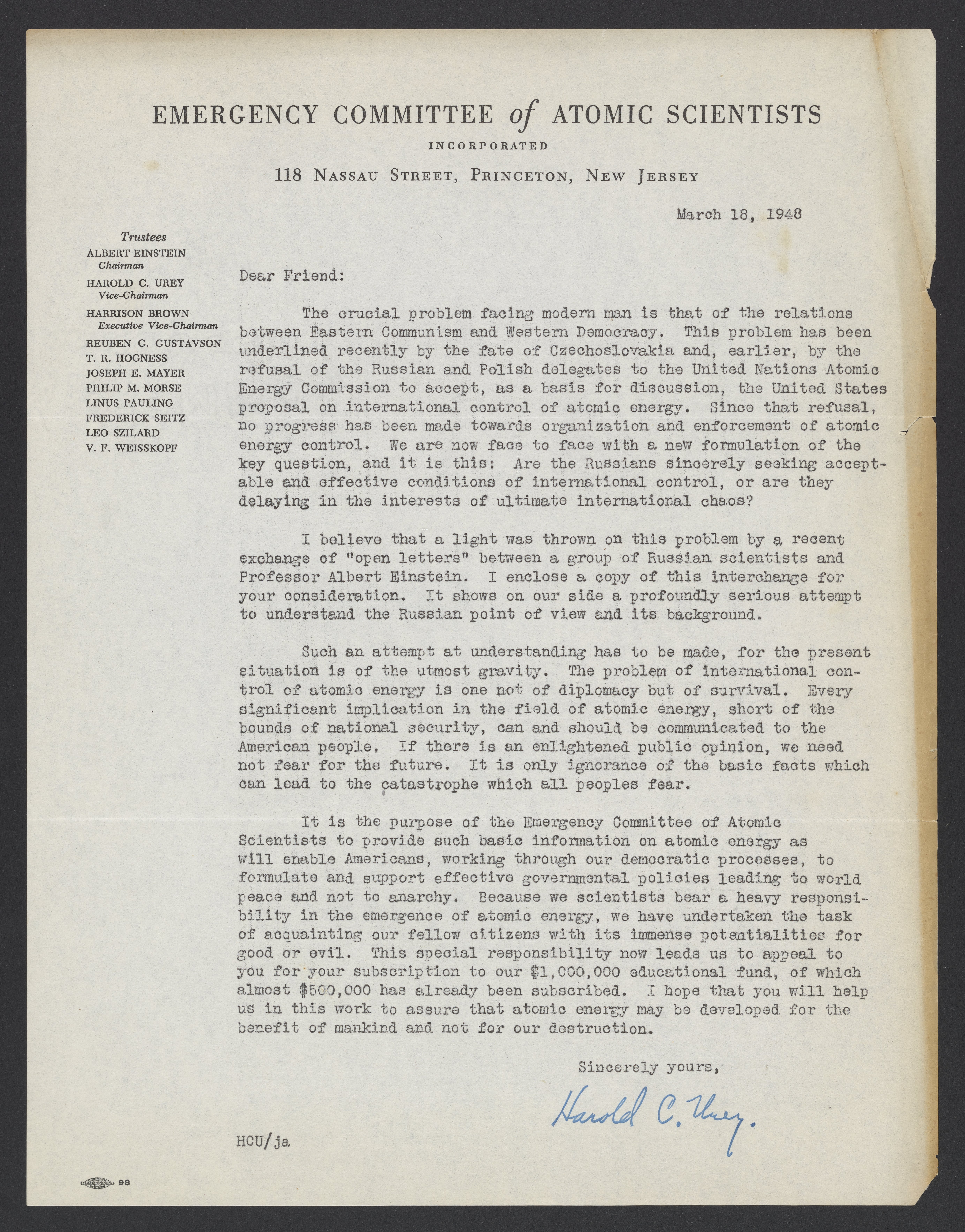 Letter from Harold C. Urey, March 18, 1948