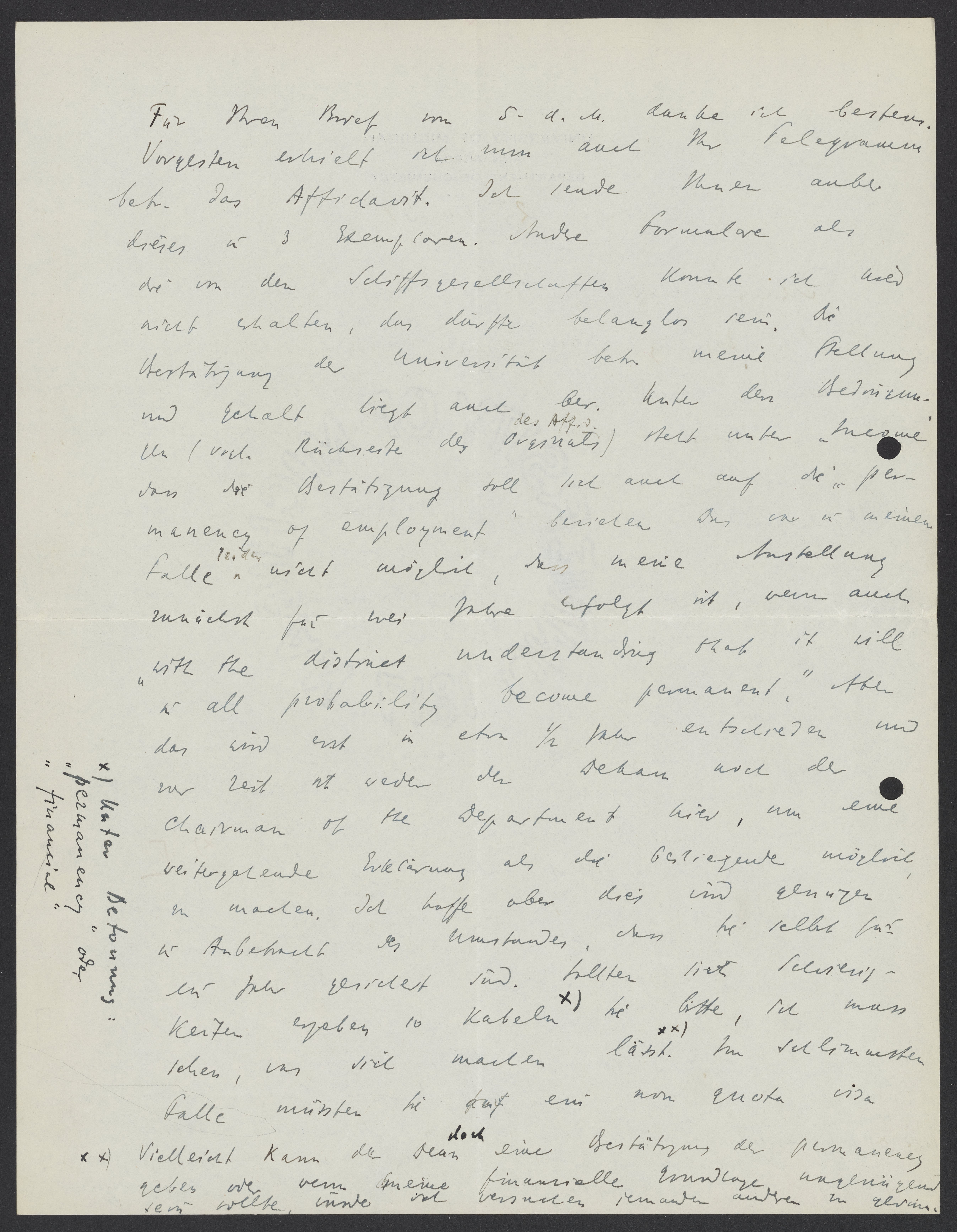 Für Ihren Brief vom 5. d.M. danke ich bestens. Vorgestern erhielt ich auch Ihr Telegramm bet. das Affidavit. Ich sende Ihnen auch dieses in 3 Exemplaren. Andere Formulare als die von den Stiftsgesellschaften konnte ich aber nicht erhalte, das dürfte belanglos sein. Die Bestätigung der Universität bet. meine Stellung u. Gehalt liegt auch bei. Unter den Bestimmungen (vergl. Rückseite des Originals) steht unter „Income“, dass die Bestätigung soll sich auf die „permanency of employment“ beziehen. Das ist leider in meinem Falle nicht möglich, da meine Anstellung zunächst für zwei Jahre erfolgt ist, wenn auch „with the distinct understanding that it will in all probability become permanent.“ Aber das wird erst in etwas ½ Jahr entschieden und zur Zeit ist weder der Dekan noch der Chairman of the Department hier, um eine weitergehende Erklärung als die beiliegende möglich zu machen. Ich hoffe aber dies im genauen Anbetracht des Umstandes, dass Sie selbst fuer ein Jahr gesichert sind. Sollten sich Schwierigkeiten erfolgen kabeln* Sie bitte, ich muss sehen, was sich machen lässt.** Im schlimmsten Falle müssten Sie auf ein non quota Visa