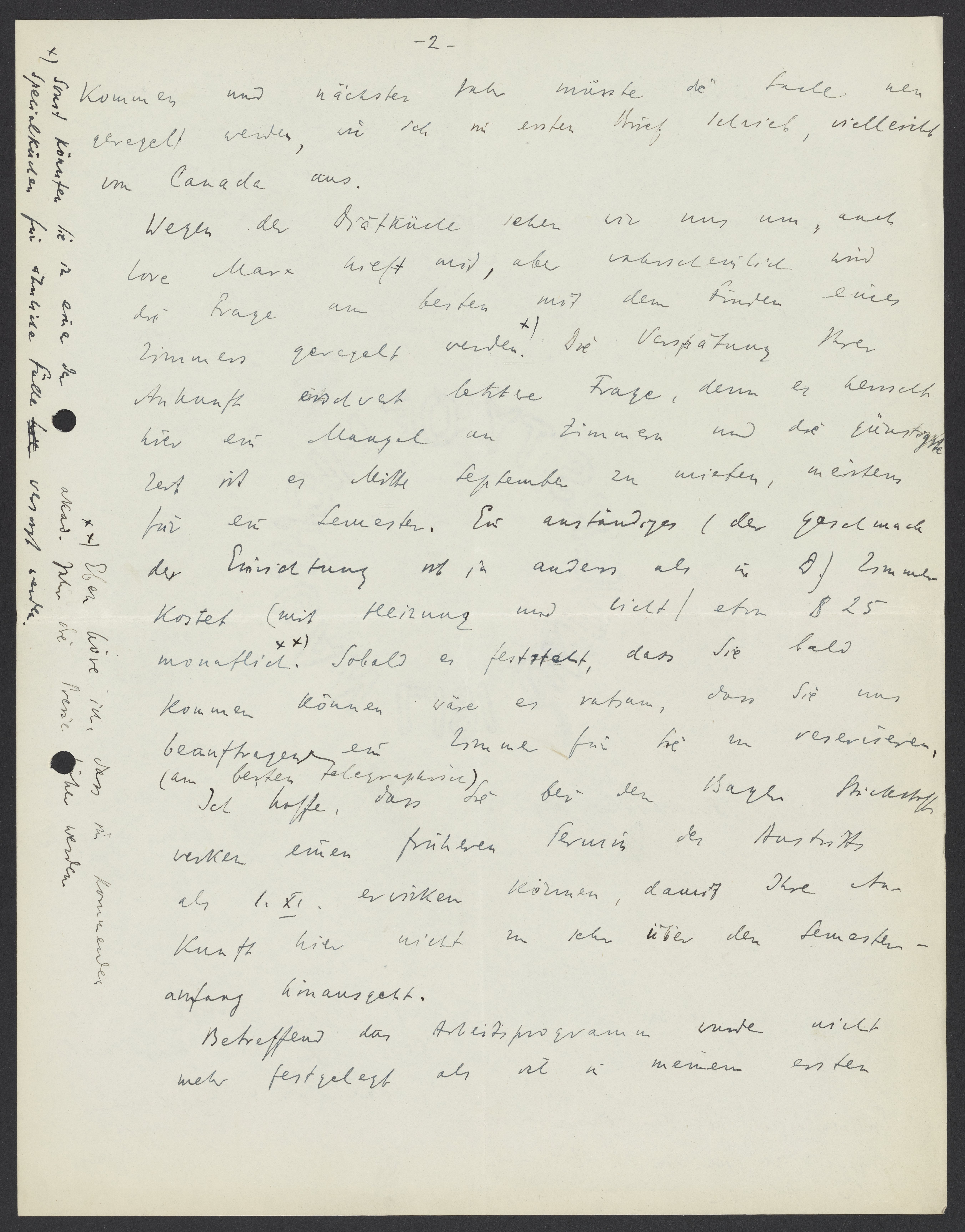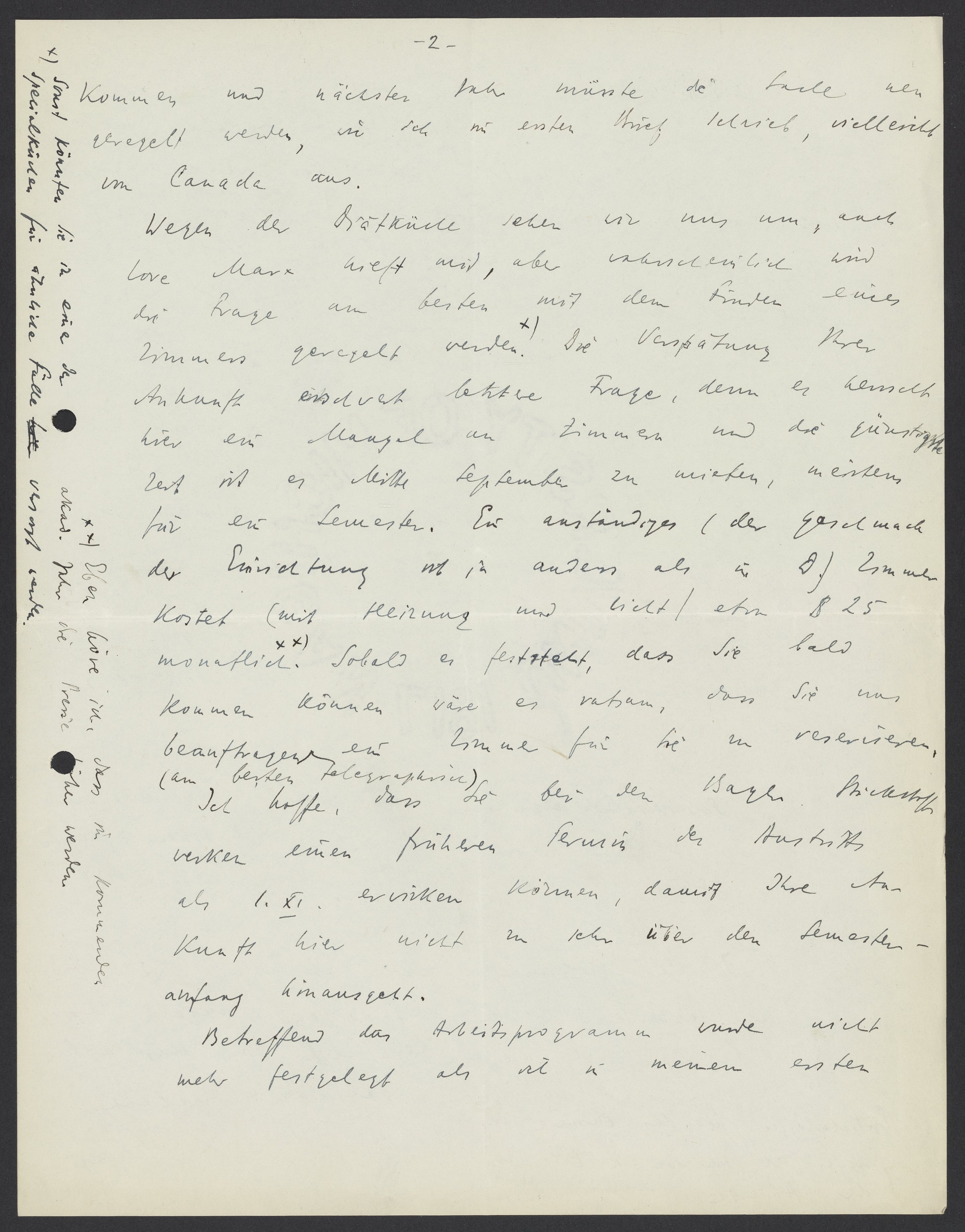 Regarding your special diet, Lore Marx is also helping. Perhaps this will be settled when a room is found.* Your delayed arrival complicates matters as there is a shortage of rooms here, and mid-September is the most convenient time to rent for a semester. A decent room (with or without heating) typically costs around $25 per month**, though the furnishings may differ from those in Germany. If you think you may be coming soon, it would be advisable to task us with reserving a room for you. I hope that the Bavarian Nitrogen Works can let you leave earlier than November 1st, so that you can arrive here not long after the beginning of the semester.