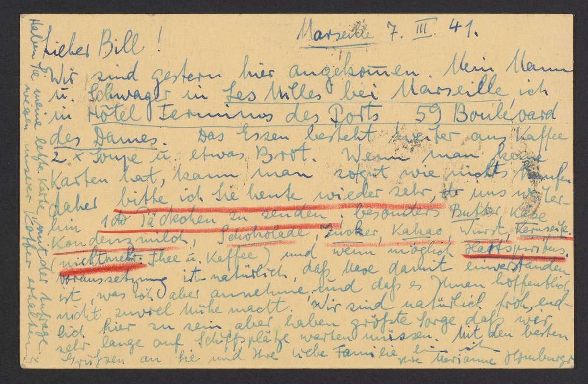 Wir sind gestern hier angekommen. Mein Mann u. Schwager in Les Milles bei Marseille, ich in in Hotel Terminus des Ports 59 Boulevard des Dames. Das Essen besteht weiter aus Kaffee, 2x Soupe u. etwas Brot. Wenn man keine Karten hat, kann man so gut wie nichts kaufen, daher bitte ich Sie heute wieder sehr, uns weiter ein 1 lb. Päckchen zu senden, besonders Butter, Käse, Kondenzmilch, Schokolade, Zucker, Kakao, Wurst, Kernseife (nicht mehr: Thee u. Kaffee) und wenn möglich, Hartspiritus. Voraussetzung ist natürlich, daß Max damit einverstanden ist, was ich aber annehme, und daß es Ihnen nicht zu viel Mühe macht. Wir sind natuerlich froh, endlich hier zu sein, aber haben größte Sorge, daß wer sehr lange auf Schiffsplätze warten müssen. Mit den besten Grüßen an Sie und Ihre liebe Familie bin ich