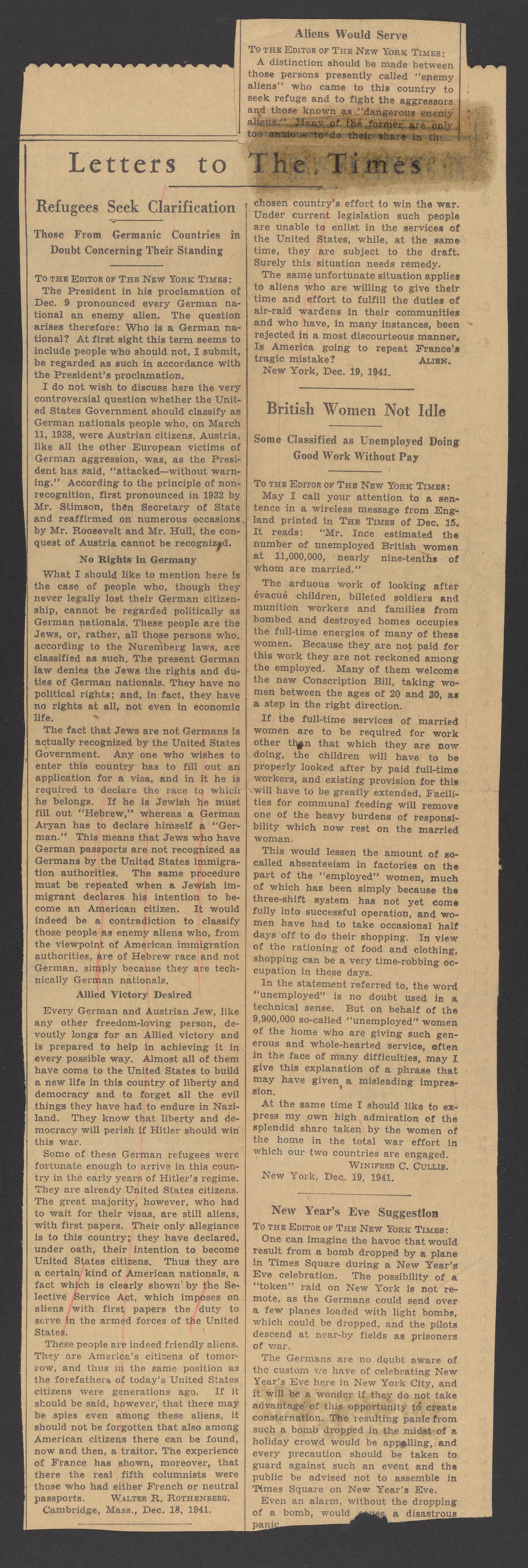 Two letters newspaper clippings, the smaller pasted to the upper righthand corner of the larger, concerning refugees and enemy aliens in the United States: Refugees Seek Clarification written by Walter R. Rothenberg, and Aliens Would Serve written under the pen name "Alien".