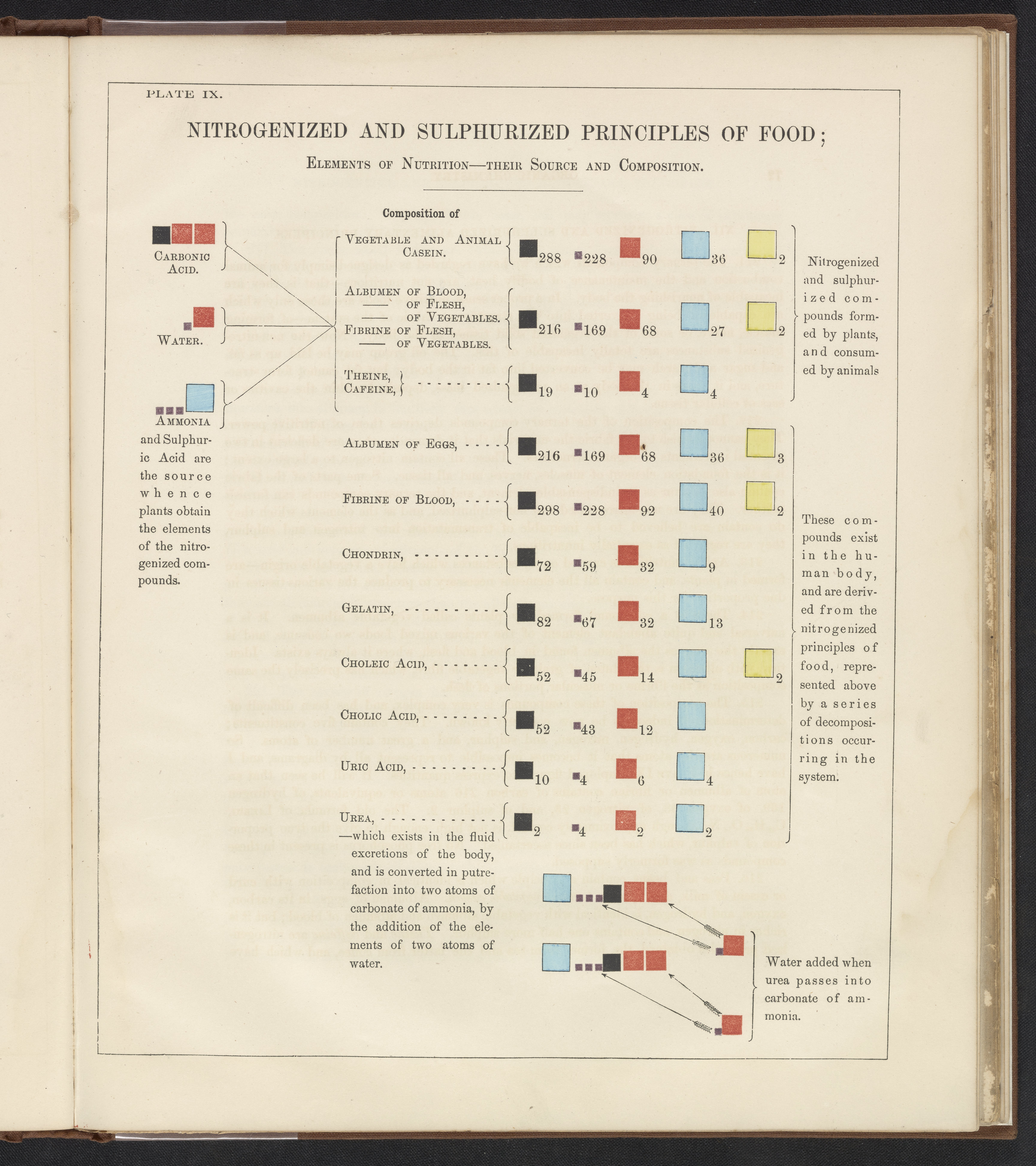 Youmans, Edward Livingston. “Plate IX: Nitrogenized and Sulphurized Principles of Food.” In Chemical Atlas; or, The Chemistry of Familiar Objects. New York, New York, 1856. https://digital.sciencehistory.org/works/eopls6e.