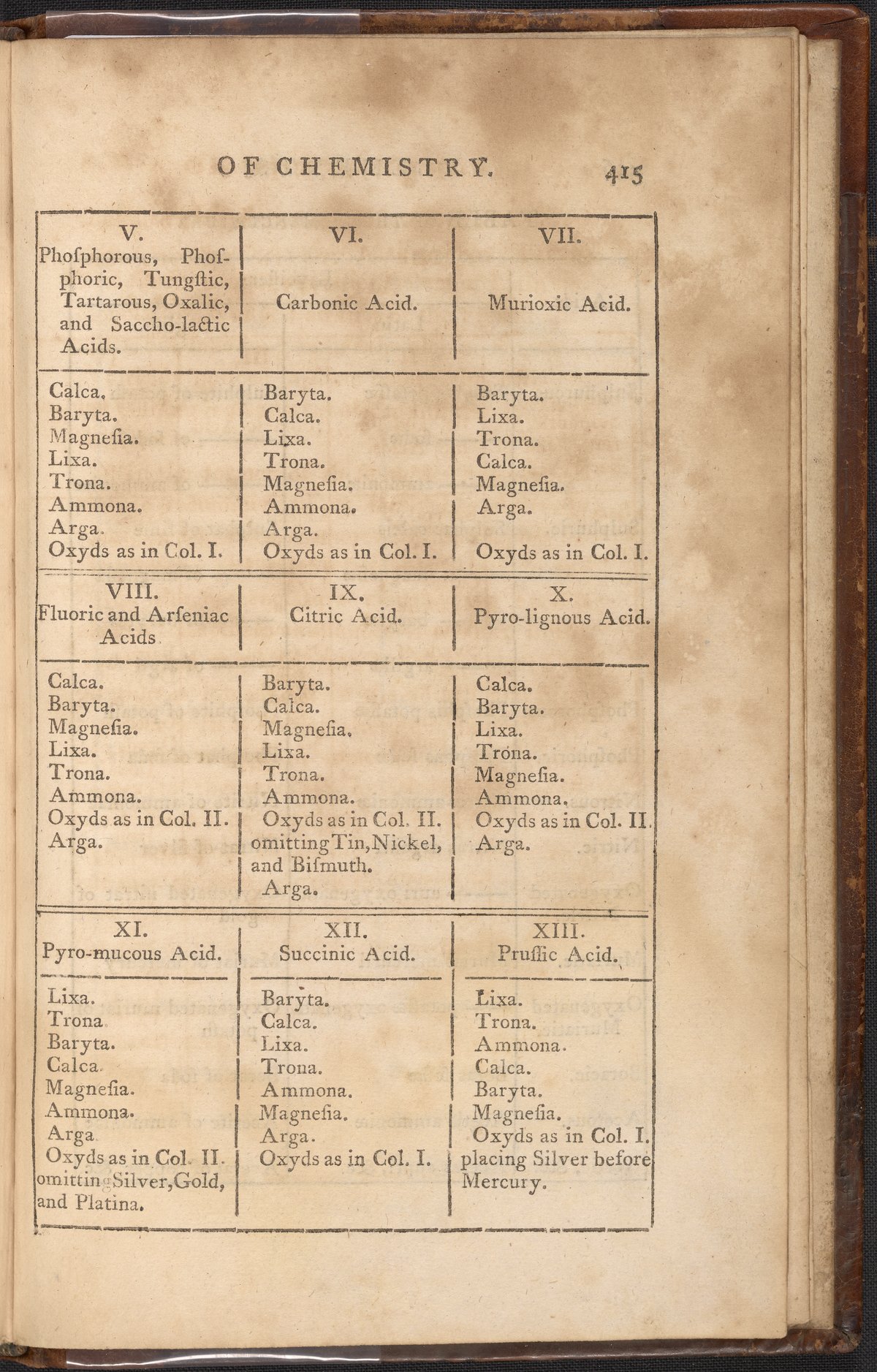 This edition included so many additions that it was necessary to divide it into two volumes, of which this is the first. Digitized content includes foldouts depicting a Table of the Binary Combinations of Oxygen and Simple Substances, Table of the Combinations of Acetous Acids with the Salisiable Bases in the Order of Affinity, as well as tables presenting chemical nomenclature guidelines and acids in order of electron affinity.