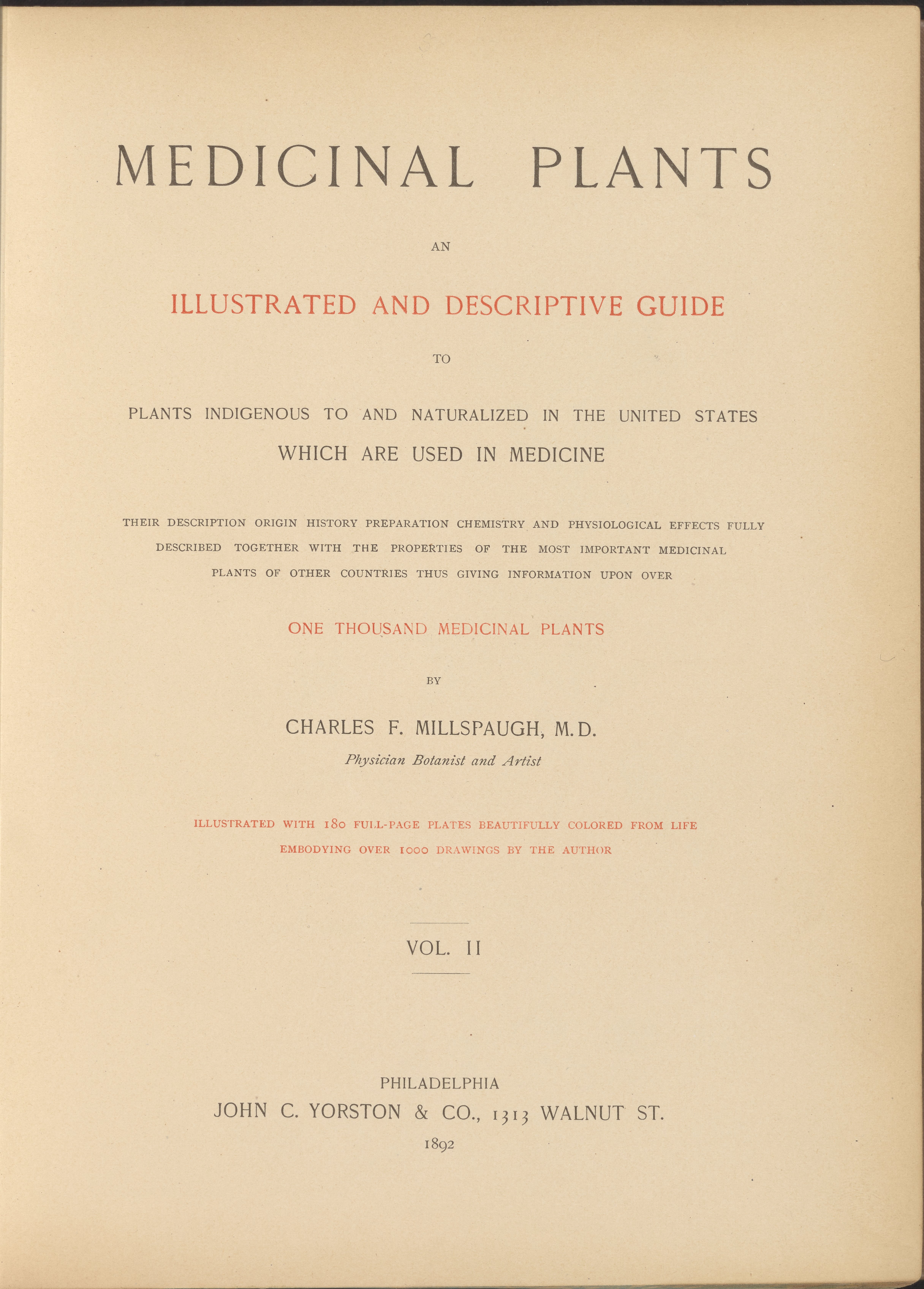Millspaugh, Charles Frederick. Medicinal Plants: An Illustrated and Descriptive Guide to Plants Indigenous to and Naturalized in the United States, Volume II. Philadelphia, Pennsylvania: John C. Yorston & Co., 1892. https://digital.sciencehistory.org/works/ew1s9mj.