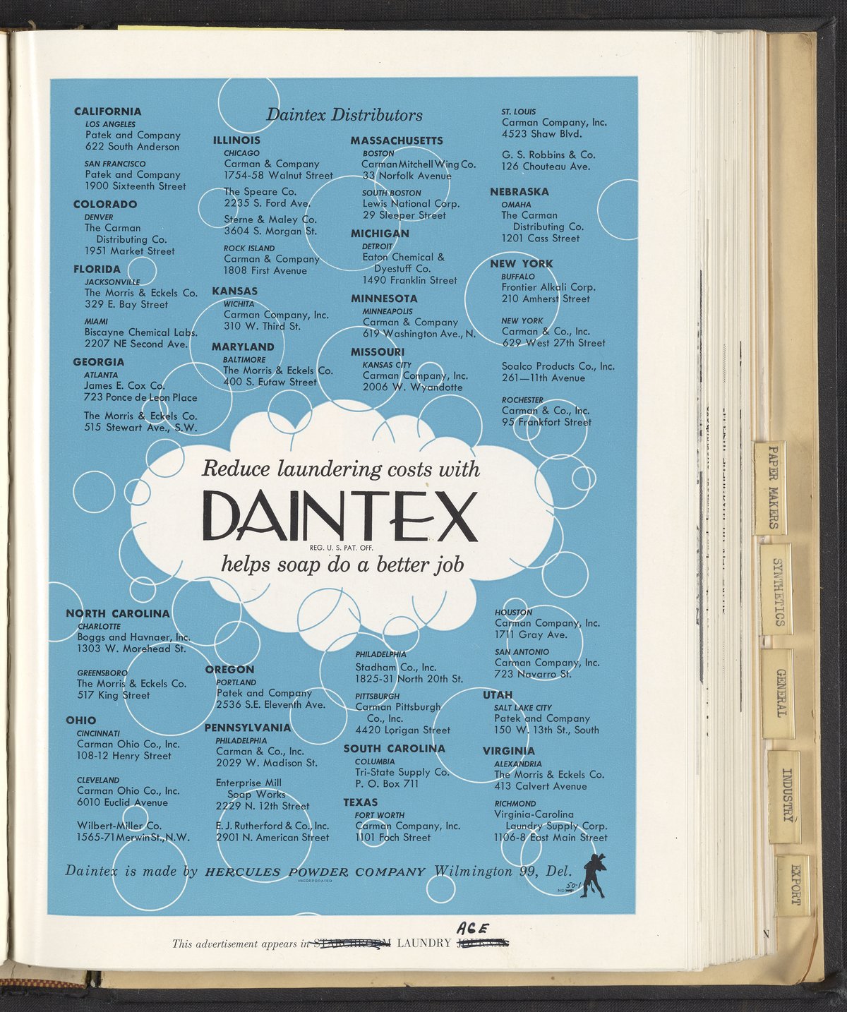 Hercules Incorporated. “Reduce Laundering Costs with Daintex.” 1950 Hercules Advertisements, 1950. Records of Hercules Incorporated, Volume 1950. Science History Institute. Philadelphia. https://digital.sciencehistory.org/works/exhce5m.